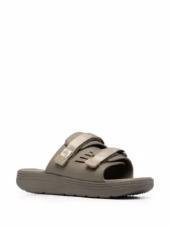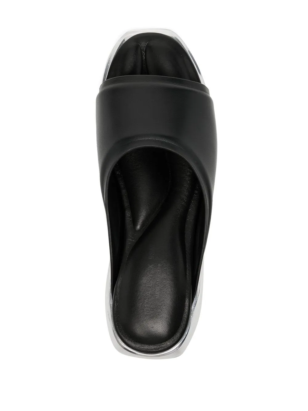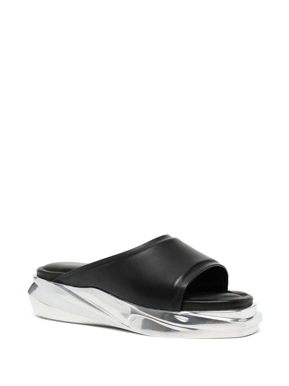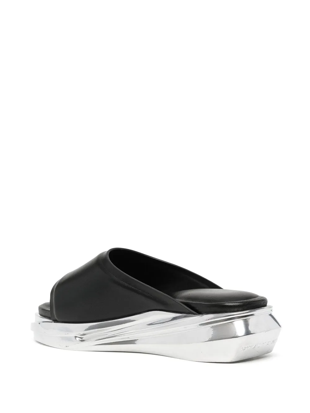 chunky-sole slide sandals from 1017 Alyx 9SM featuring black, silver-tone, leather, metallic effect, raised logo detail, open toe, slip-on style, branded leather insole and chunky rubber sole.