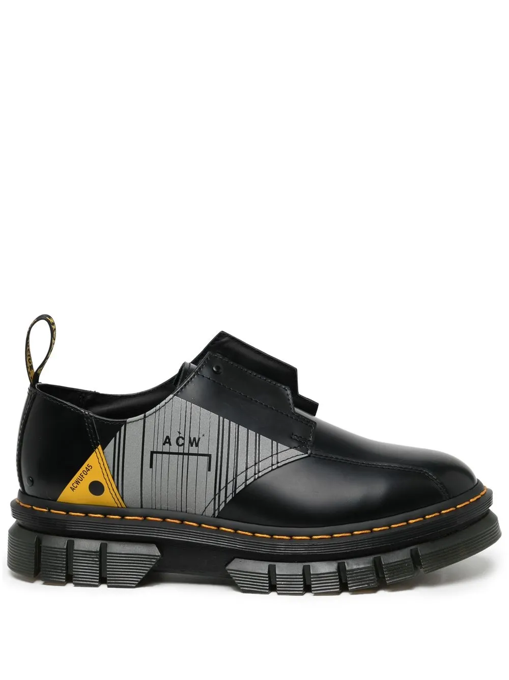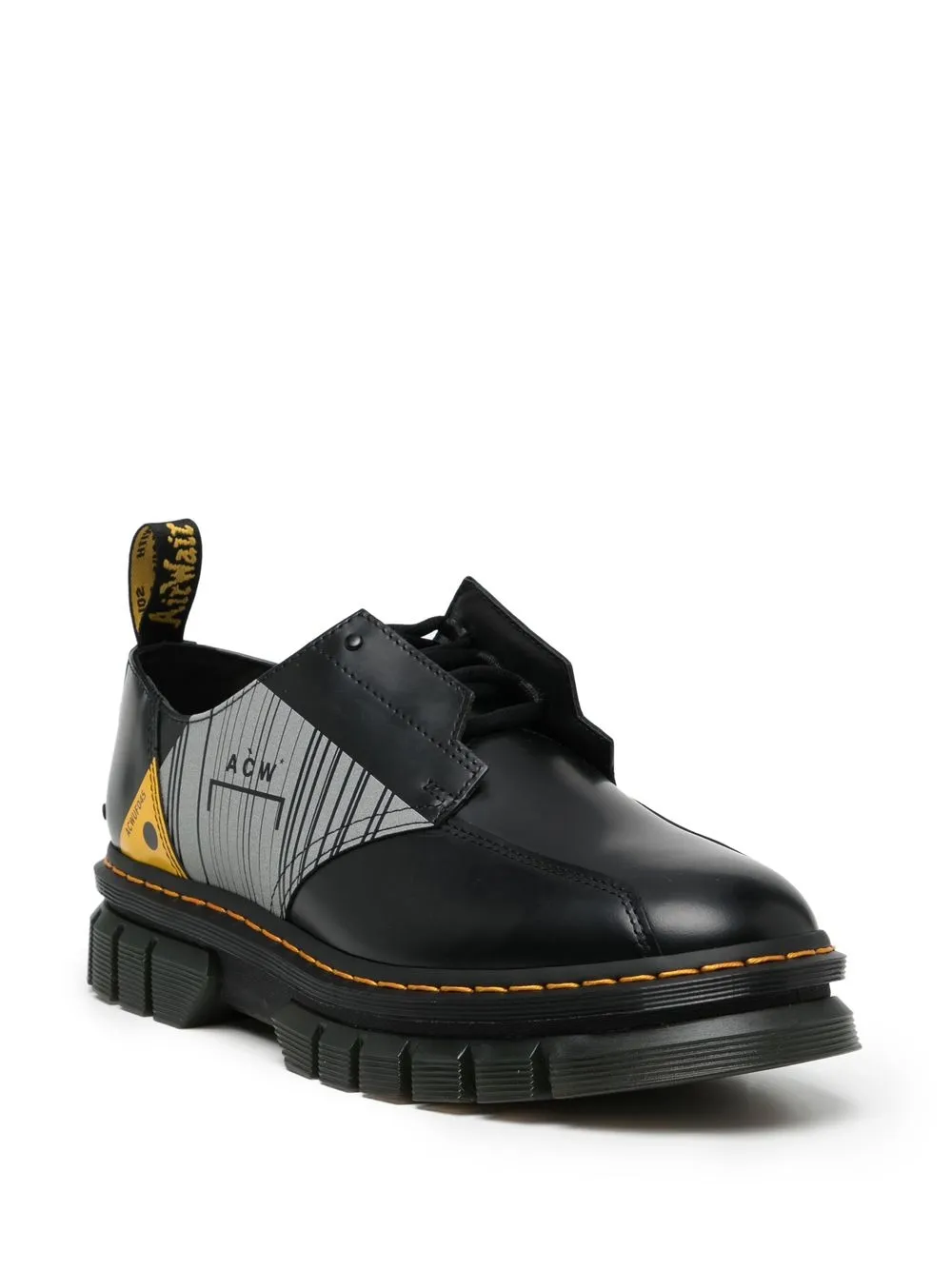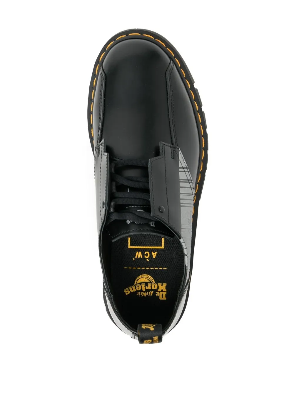 x Dr Martens Bex Neoteric 1461 derby shoes from A-COLD-WALL* featuring black, grey, yellow, leather, logo print to the side, graphic print to the front, round toe, contrast stitching, logo pull-tab at the heel, front lace-up fastening, chunky rubber sole and branded insole.