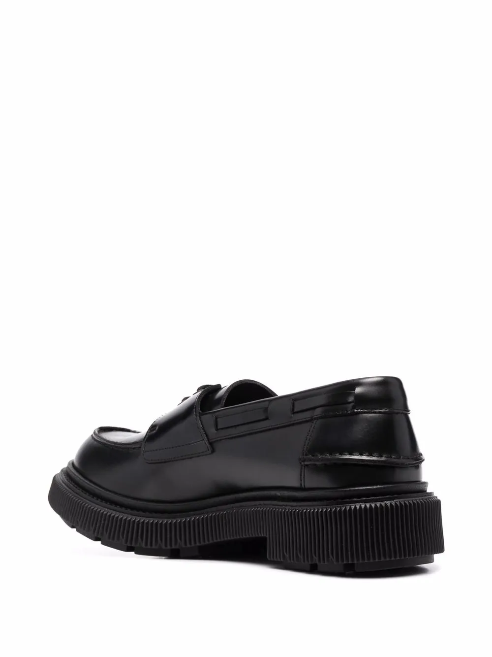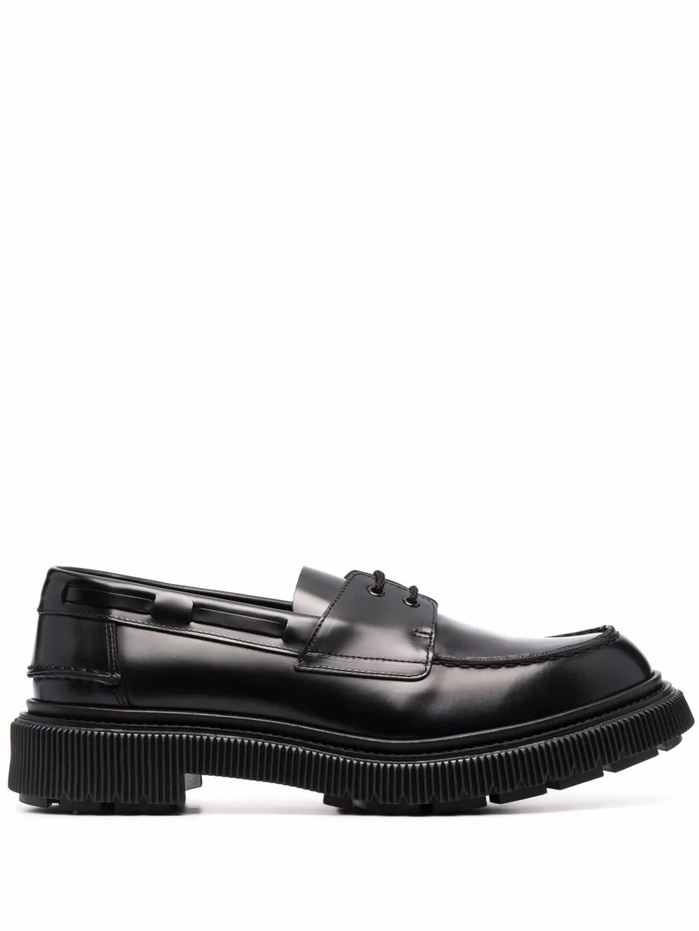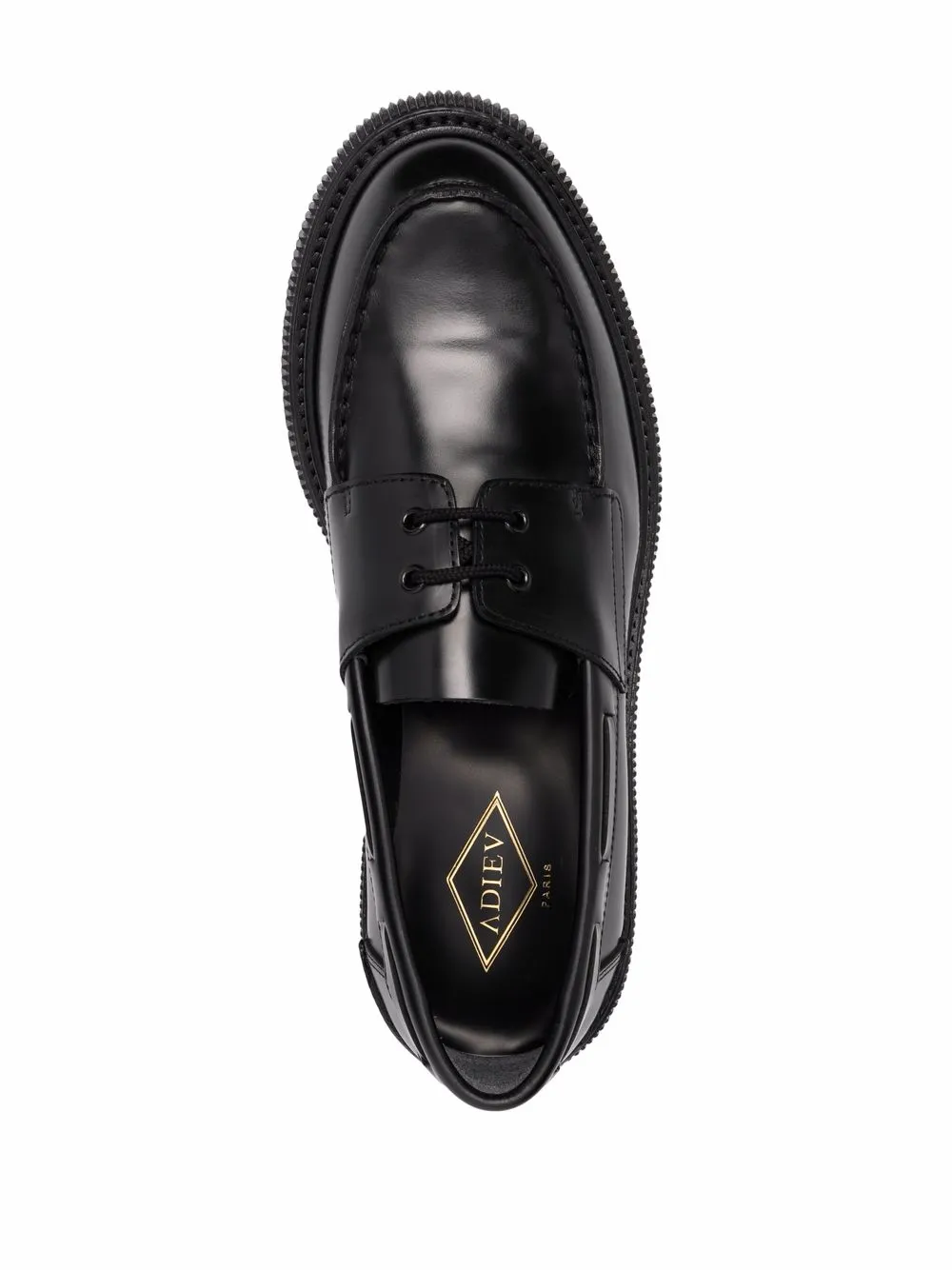 Black calf leather/leather Type 174 leather boat shoes from ADIEU PARIS featuring leather lining, almond toe, front lace-up fastening, branded insole, low heel and rubber sole.