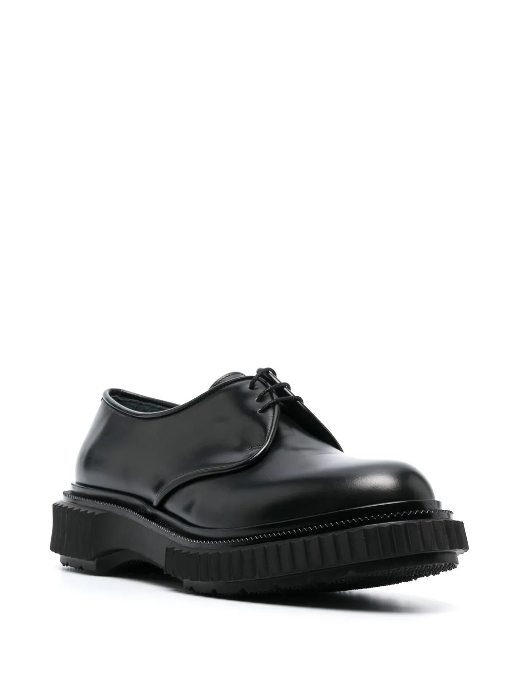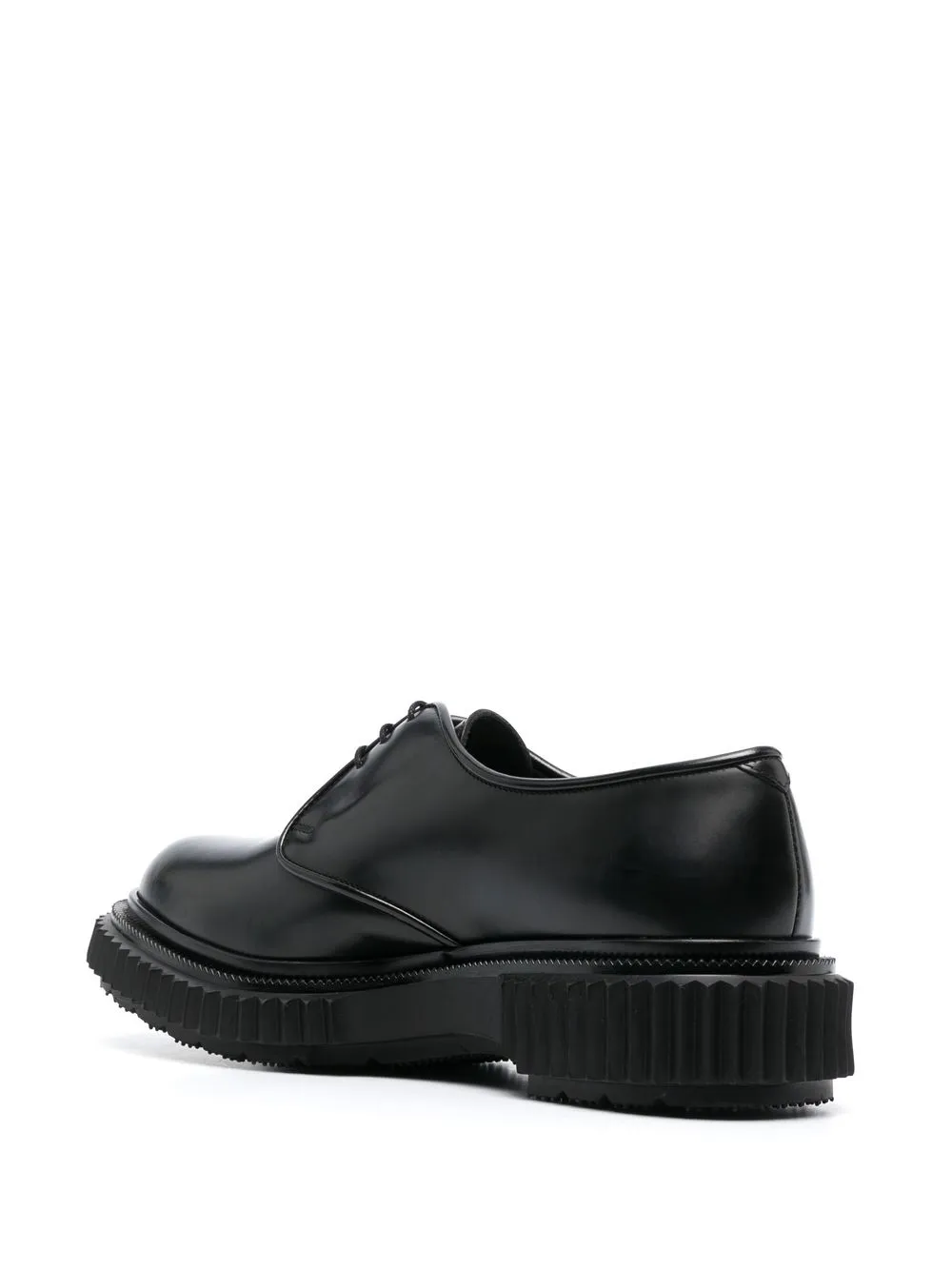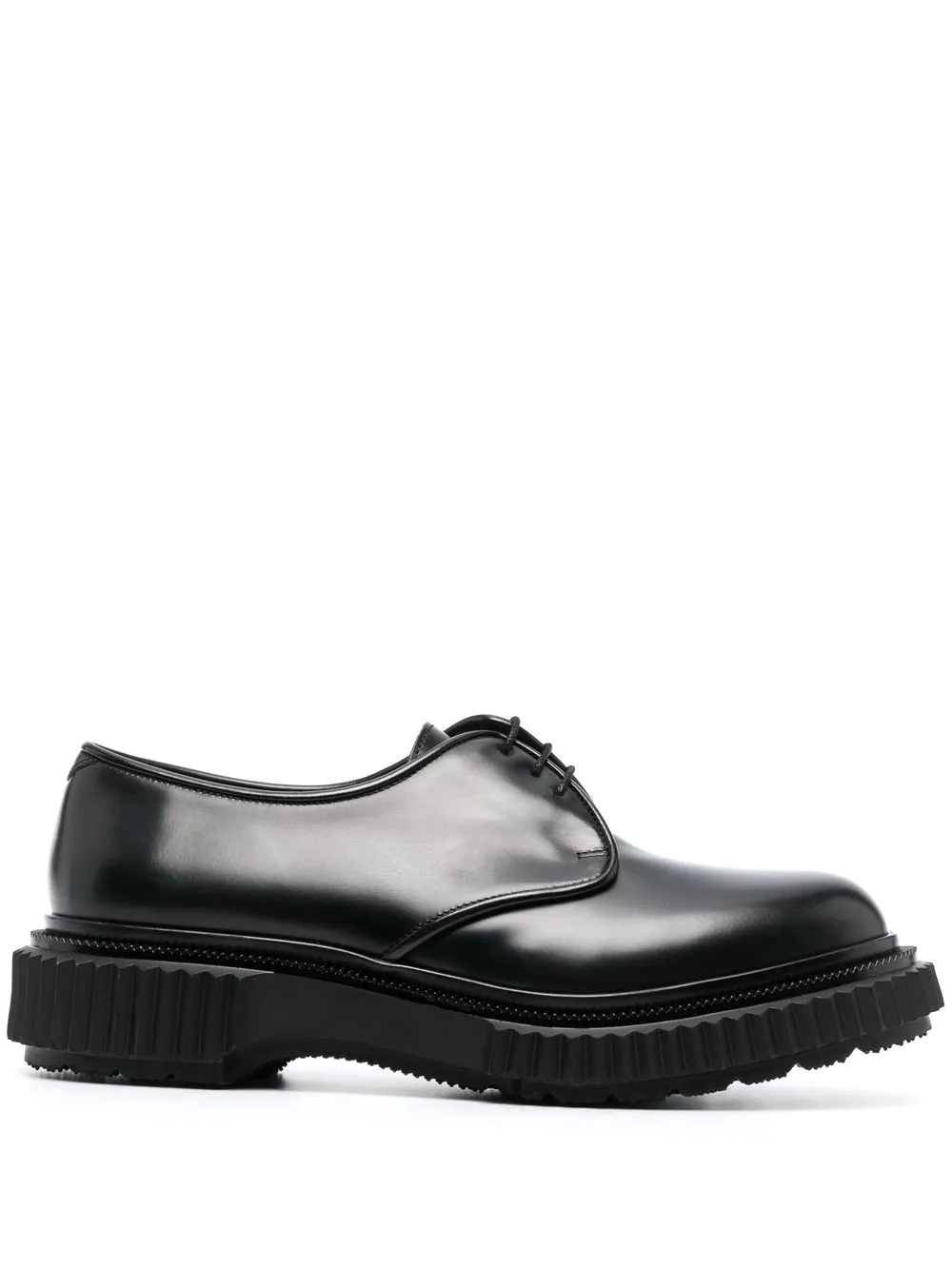 Type 190 derby shoes from ADIEU PARIS featuring black, calf leather, high-shine finish, almond toe, front lace-up fastening, stacked sole and ridged edge.