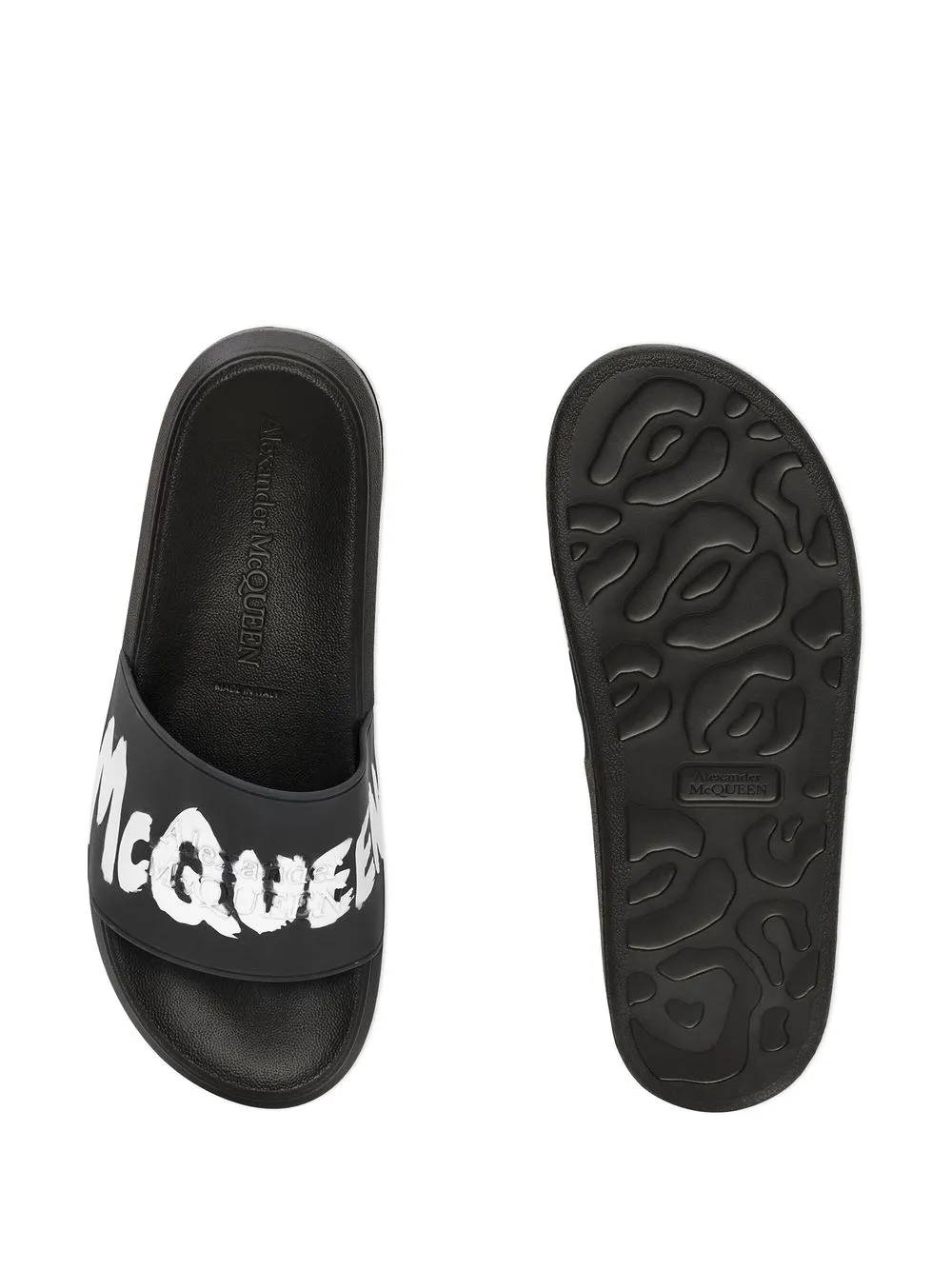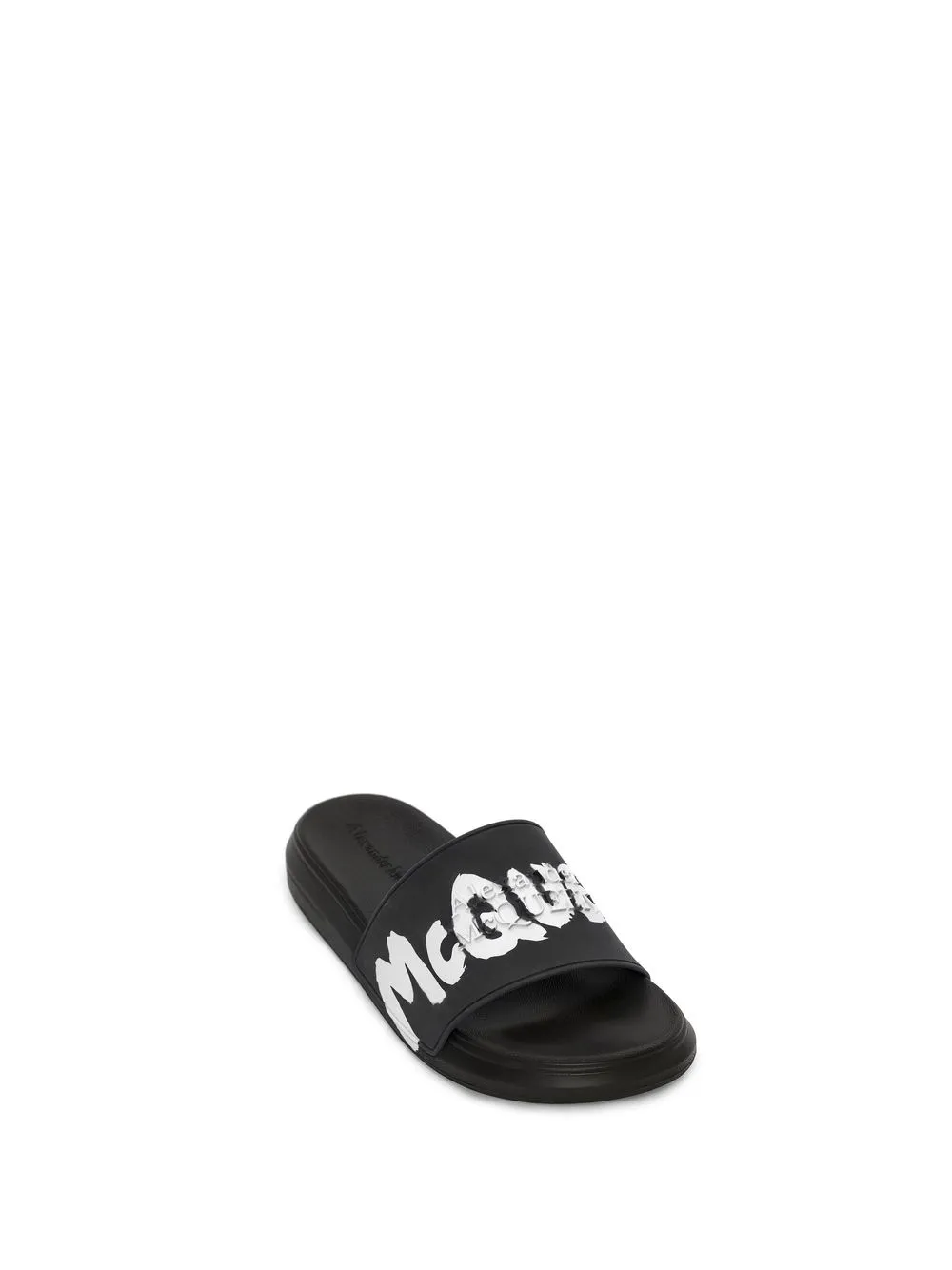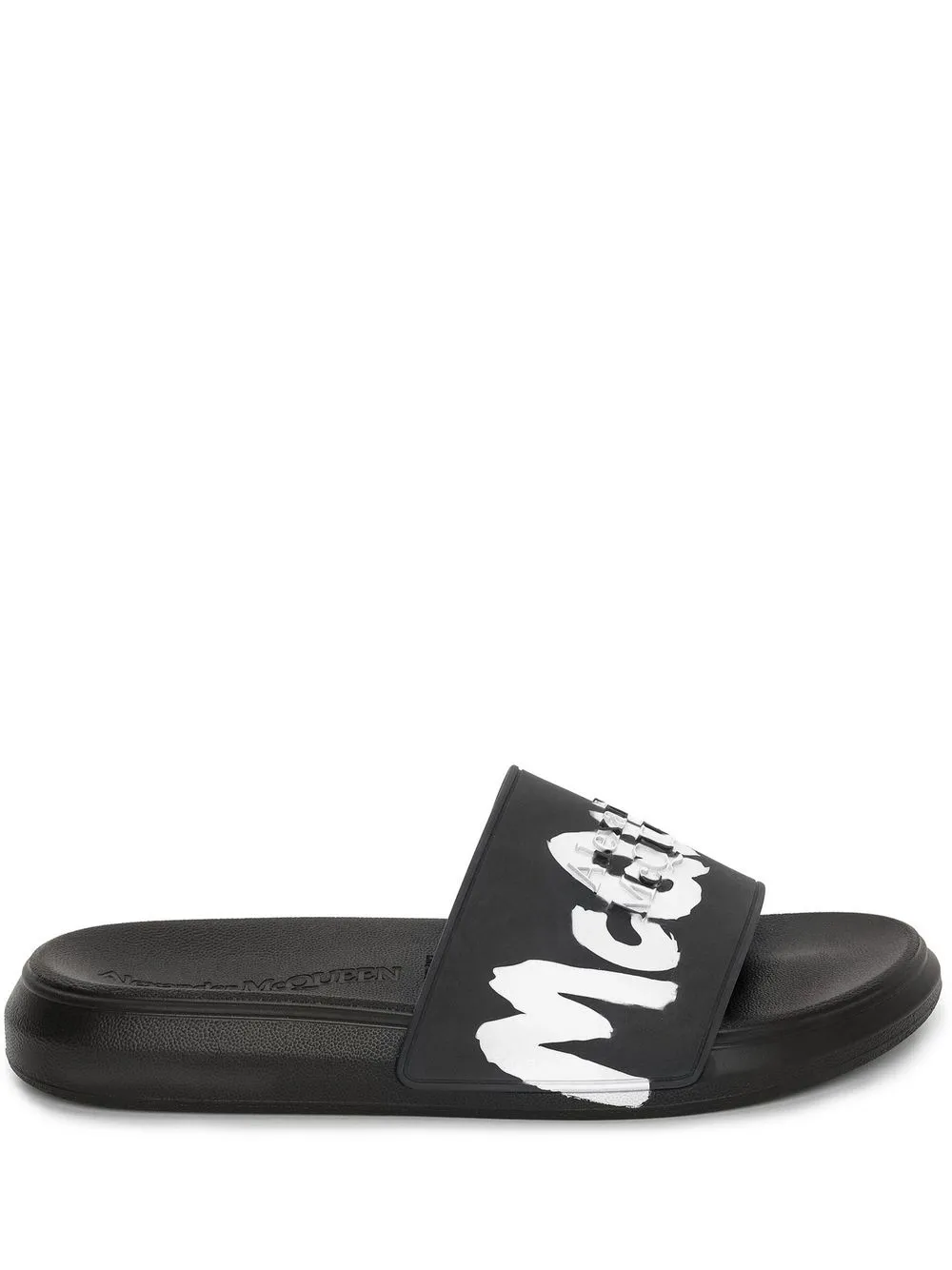 logo-print open toe slides from Alexander McQueen featuring logo print to the front, slip-on style, open toe, flat rubber sole, branded insole and black/white.