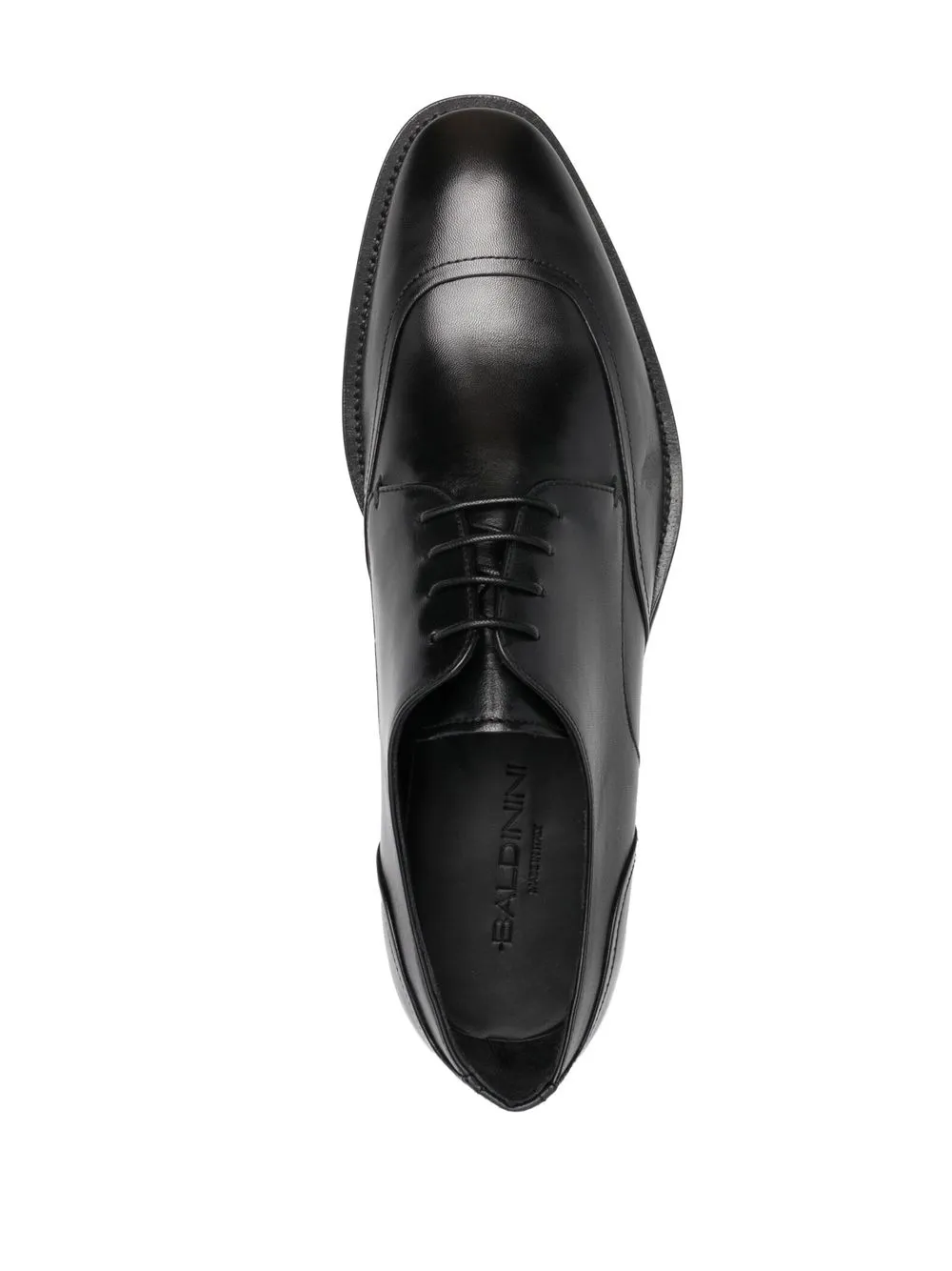 almond-toe lace-up derby shoes from BALDININI featuring black, calf leather, almond toe, front lace-up fastening, flat rubber sole and low block heel.