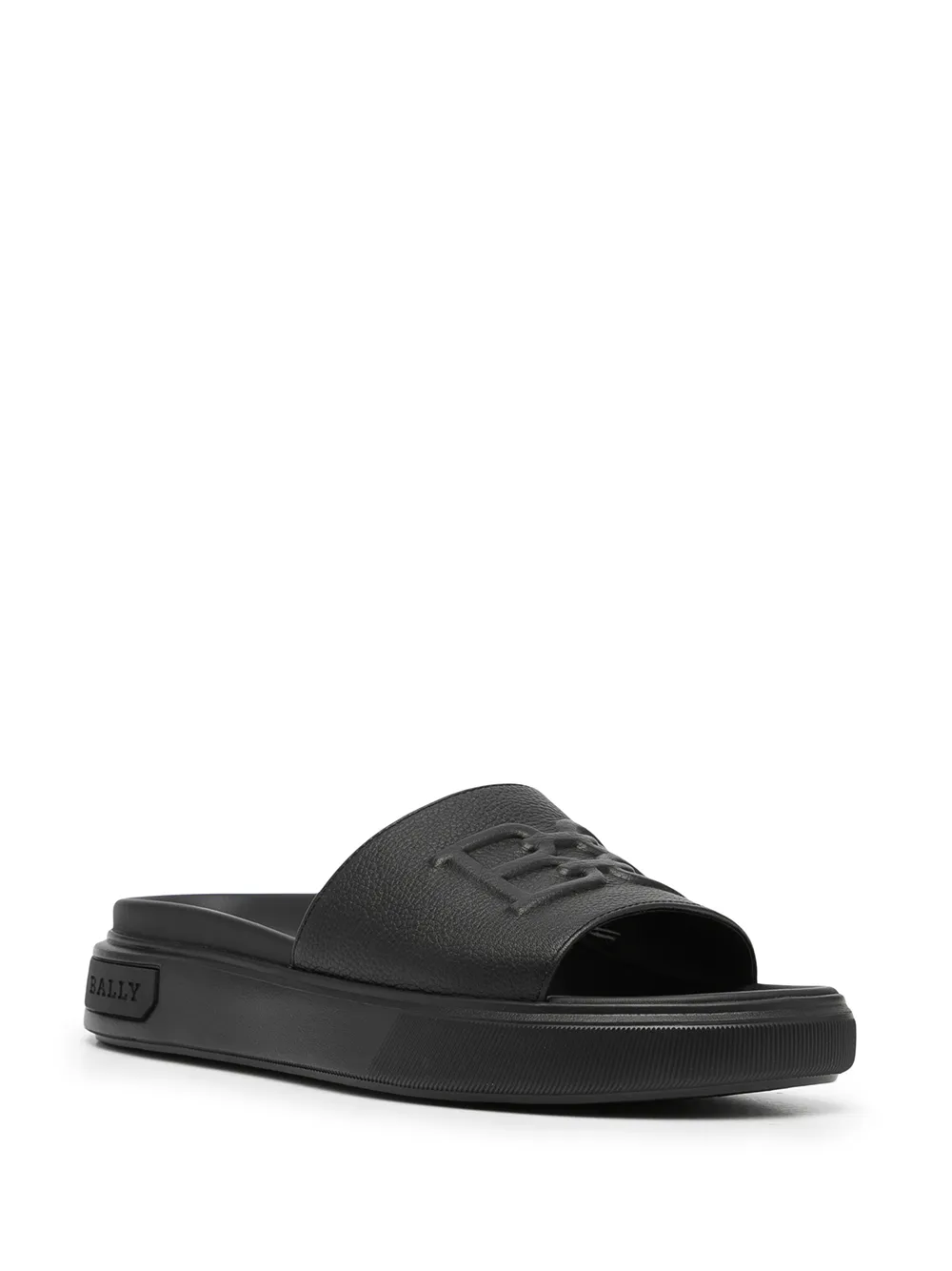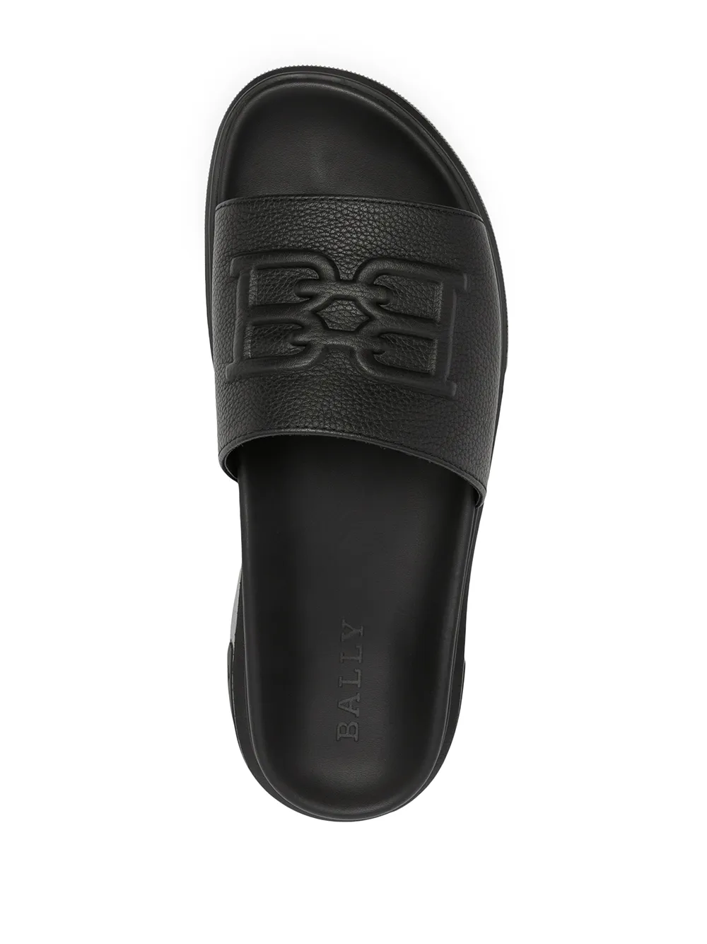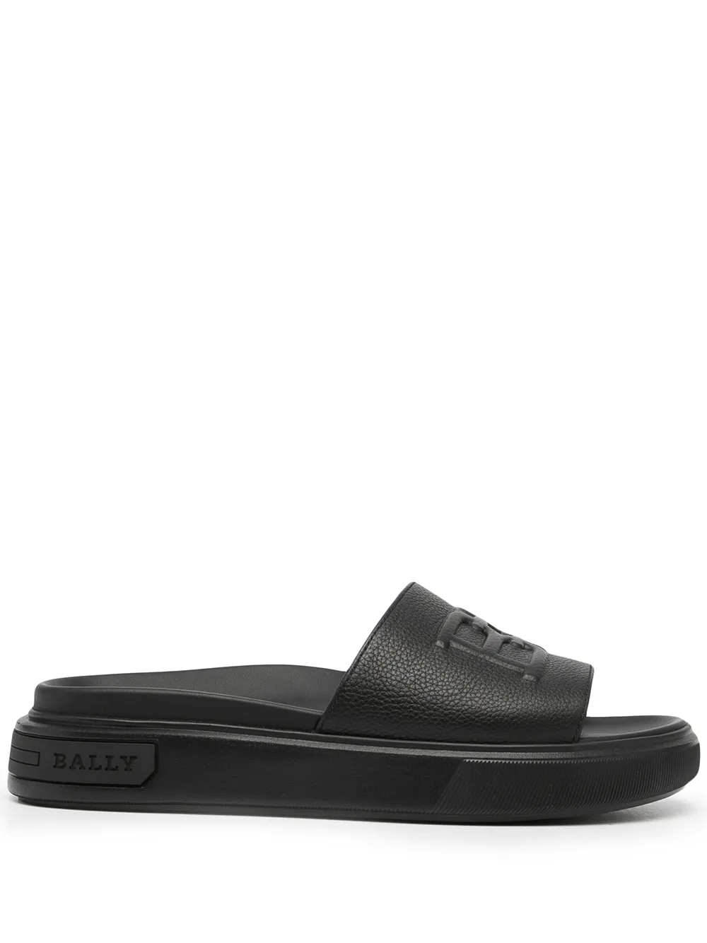 Jet-black leather embossed-logo leather slides from BALLY featuring slip-on style, embossed logo to the front, open toe and flat rubber sole.