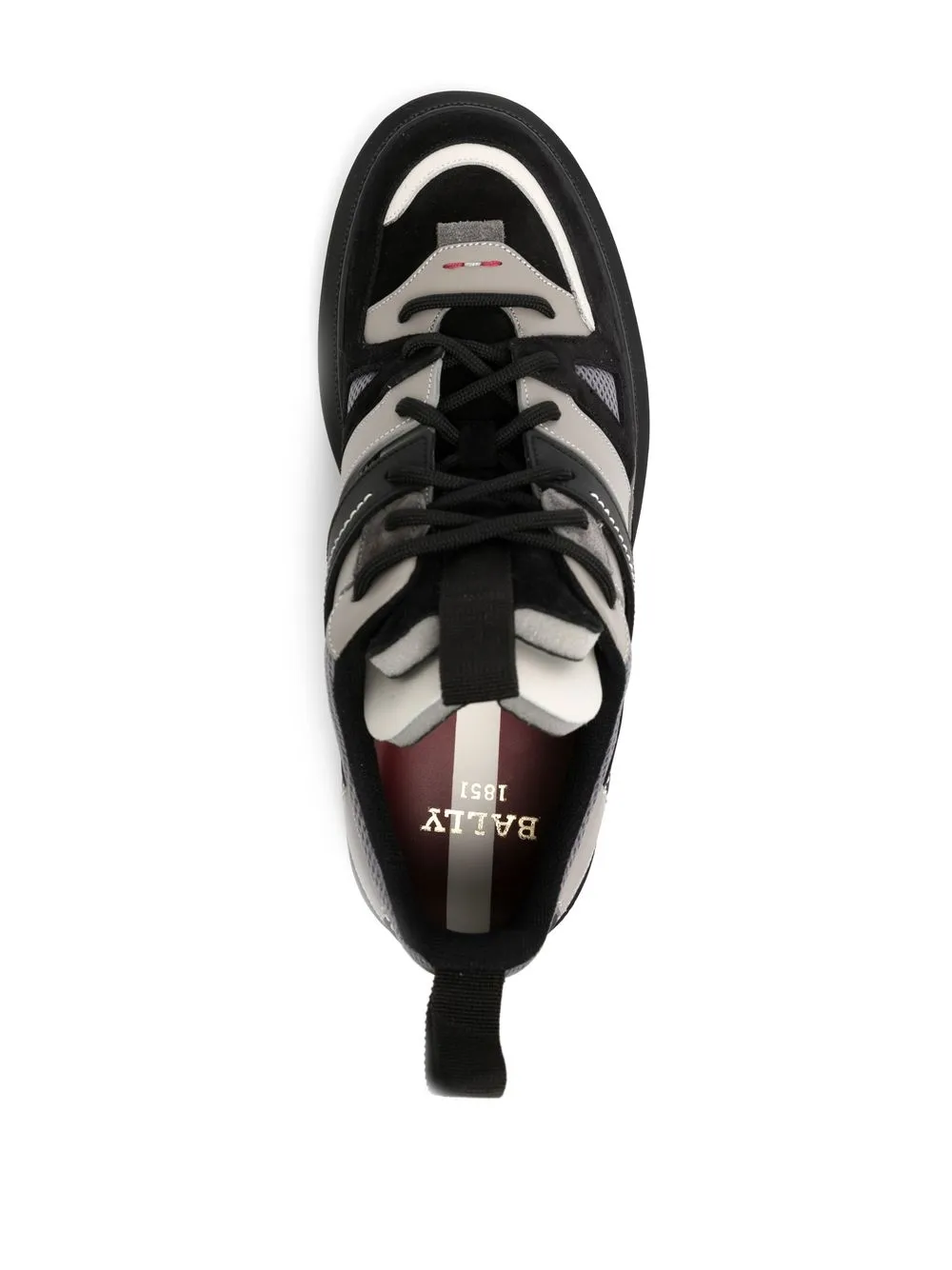 panelled lace-up shoes from BALLY featuring black, grey, panelled design, tonal design, contrast stitching, round toe, front lace-up fastening, branded insole, ridged rubber sole and 40mm heel.