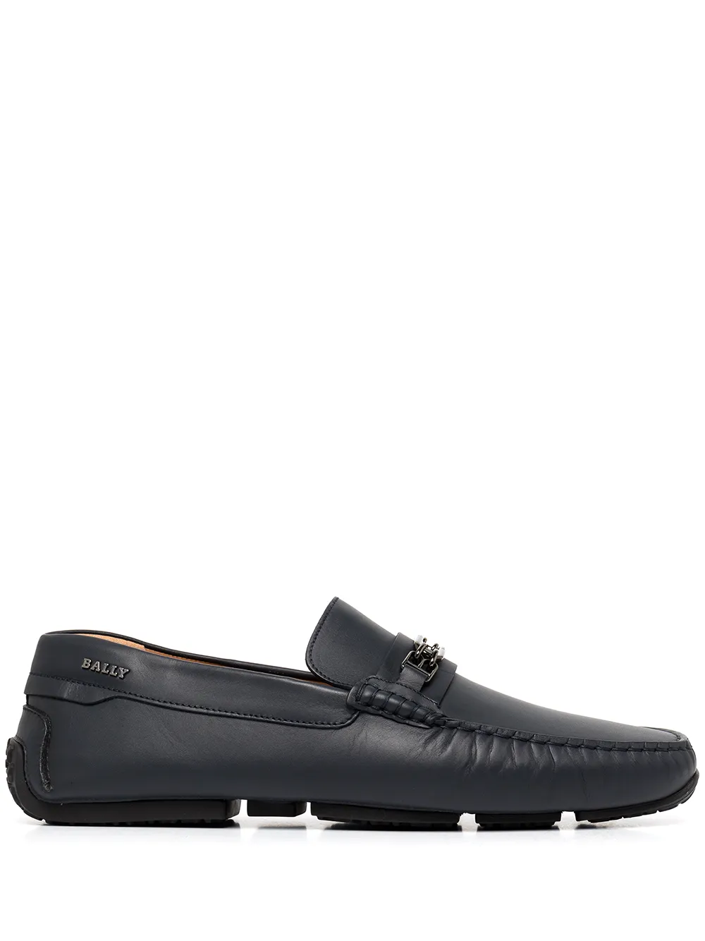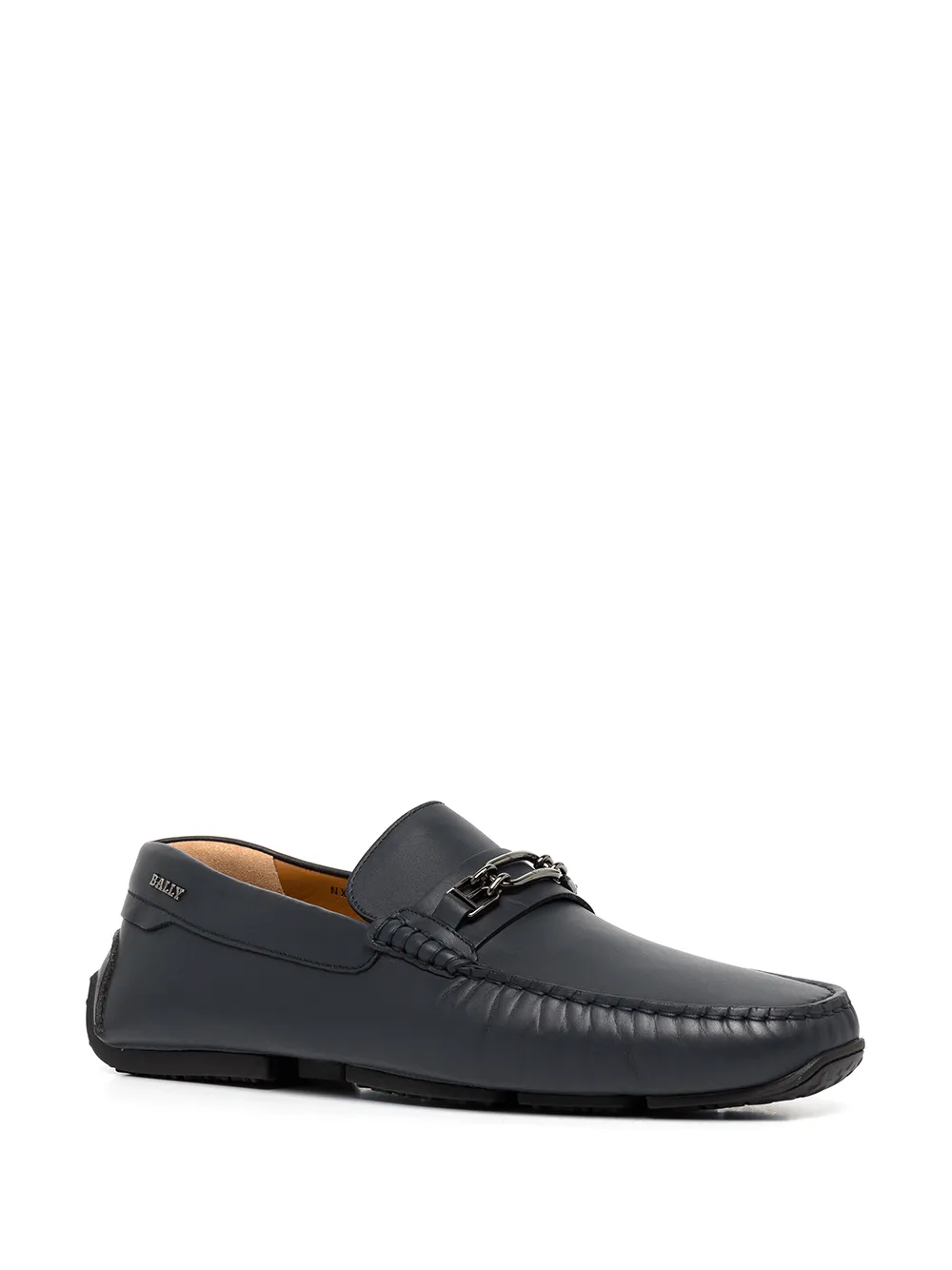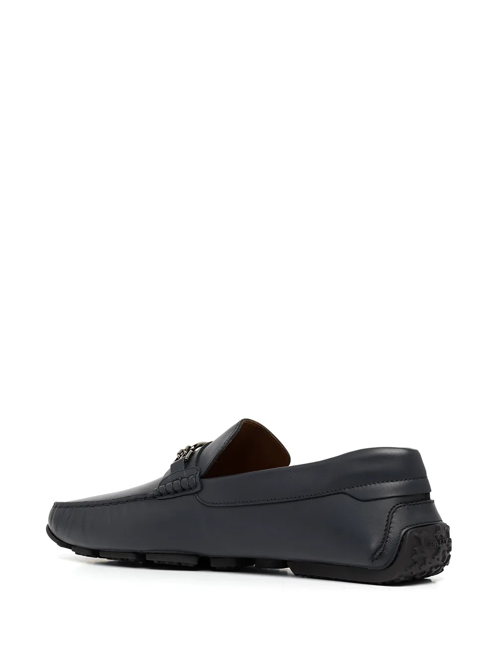 Midnight blue leather Philip boat shoes from BALLY featuring chain-link detailing, silver-tone logo plaque, slip-on style, round toe and non-slip sole.