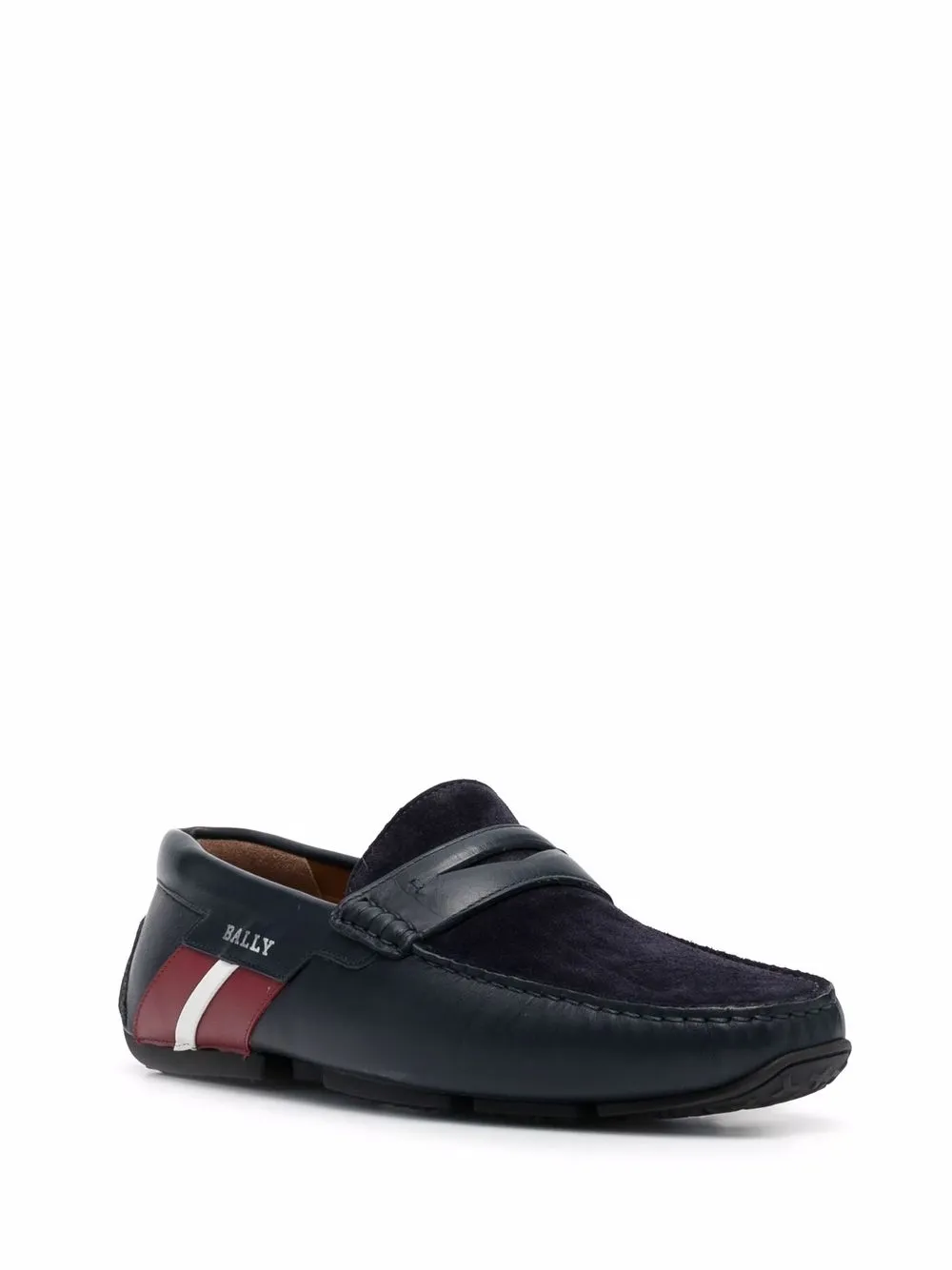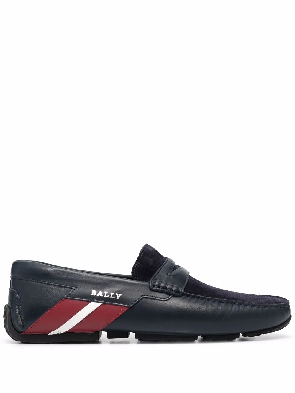 Navy-blue leather stripe-detail leather moccasins from BALLY featuring stripe detailing, round toe, flat rubber sole and slip-on style.