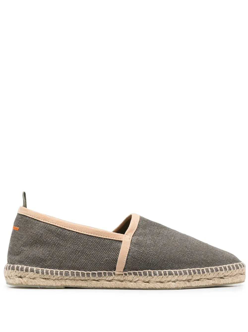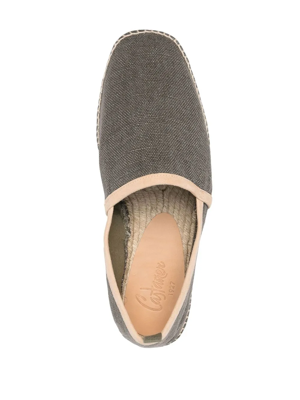 Grey Paul V espadrilles from Castañer featuring contrast stitching, contrasting trim, braided raffia sole, round neck, branded leather insole, pull-tab at the heel and rubber sole.