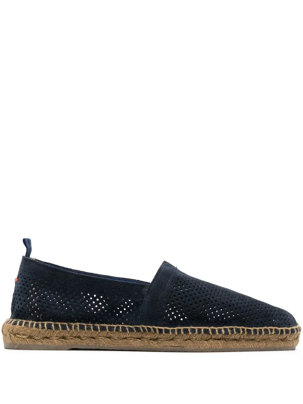 perforated-detail suede espadrilles from Castañer featuring braided raffia sole, perforated detailing, pull-tab at the heel, slip-on style, round toe, flat rubber sole, branded insole, blue and calf suede/calf leather/raffia.
