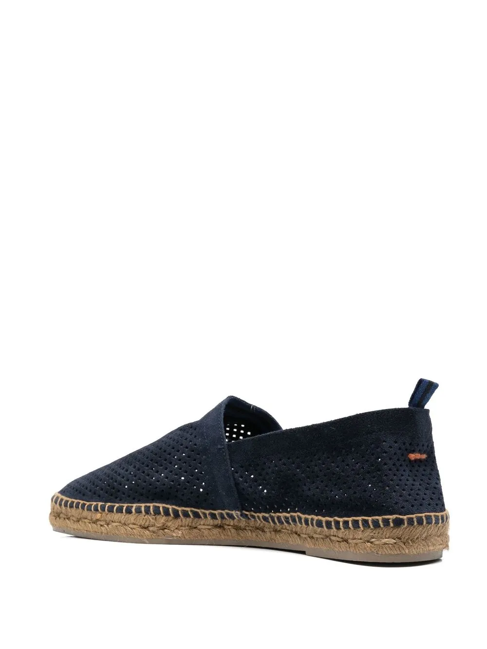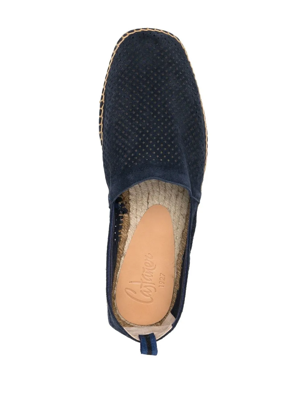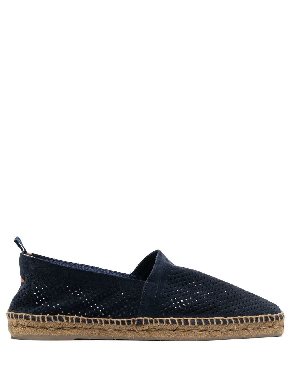 Blue leather perforated leather espadrilles from Castañer featuring perforated, braided raffia sole, pull-tab at the heel and slip-on style.