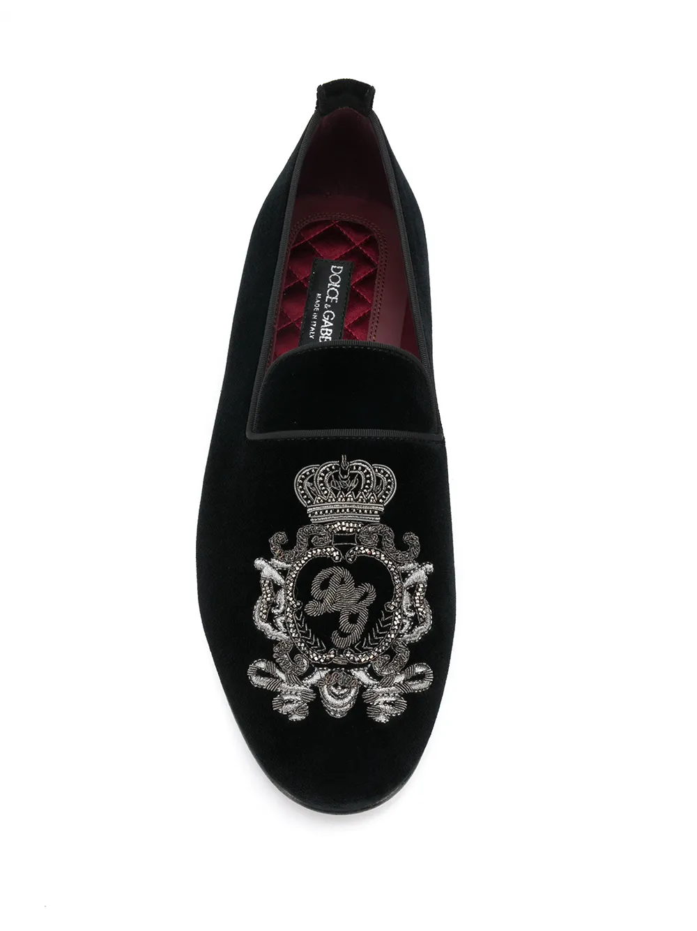 What could be more luxurious than a pair of velvet loafers? These black velvet crest bead embroidered loafers from Dolce & Gabbana offer pure luxury. Fit for a king.
