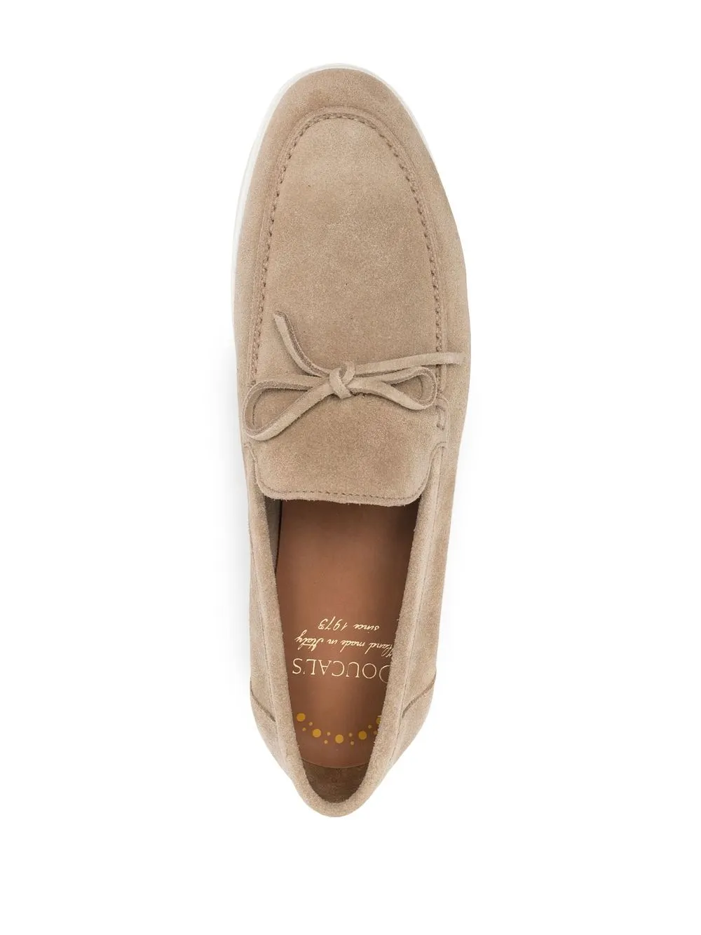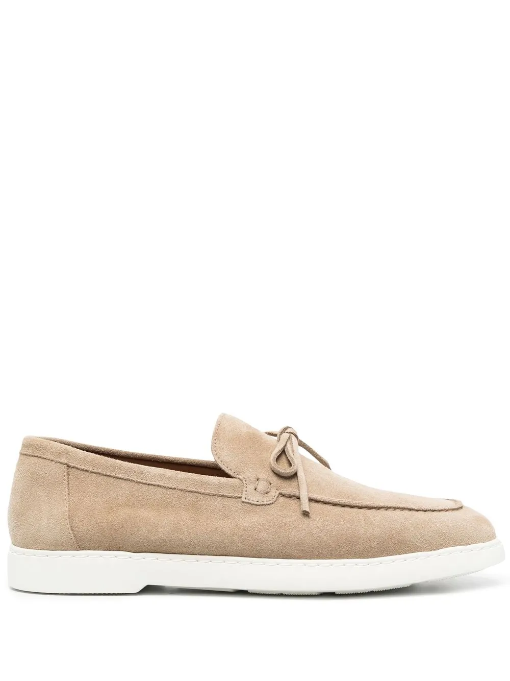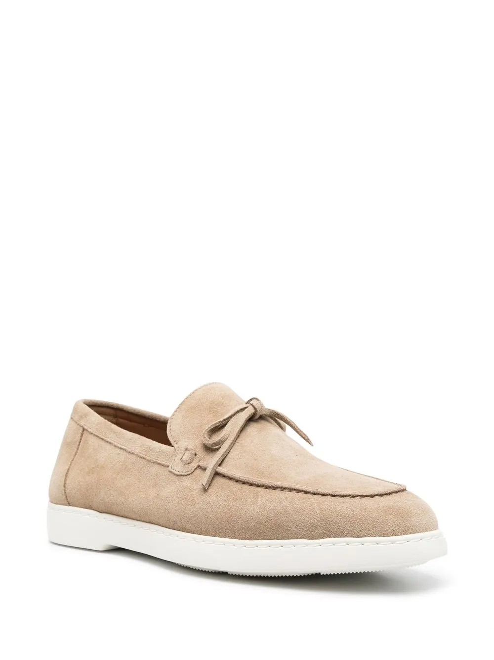 lace-detailing suede loafers from DOUCAL’S featuring beige, calf suede, tonal stitching, lace-up detailing, almond toe, flat rubber sole and slip-on style.