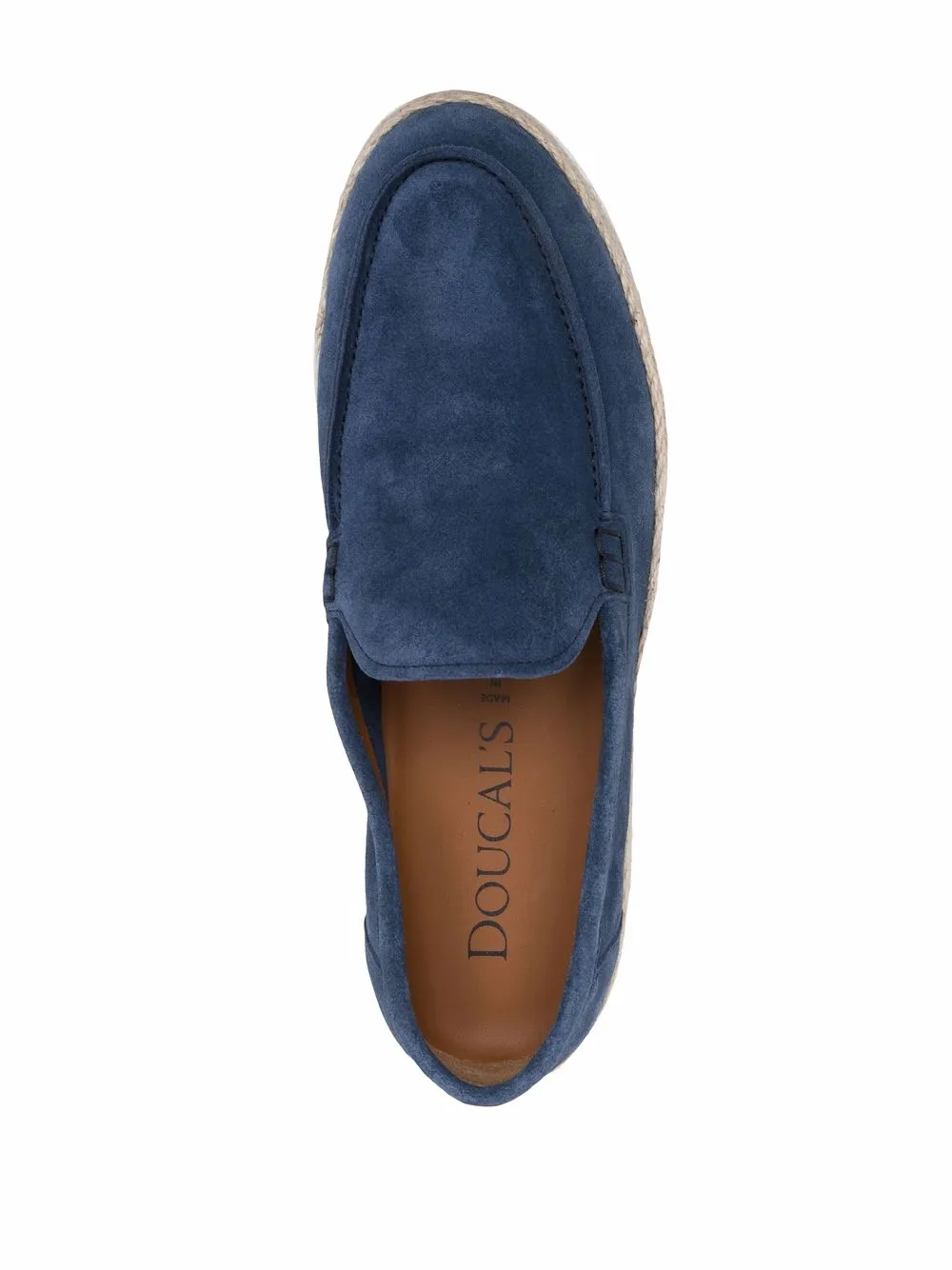 Navy calf suede/fabric/rubber slip-on espadrille loafers from DOUCAL’S featuring slip-on style, round toe and flat sole.