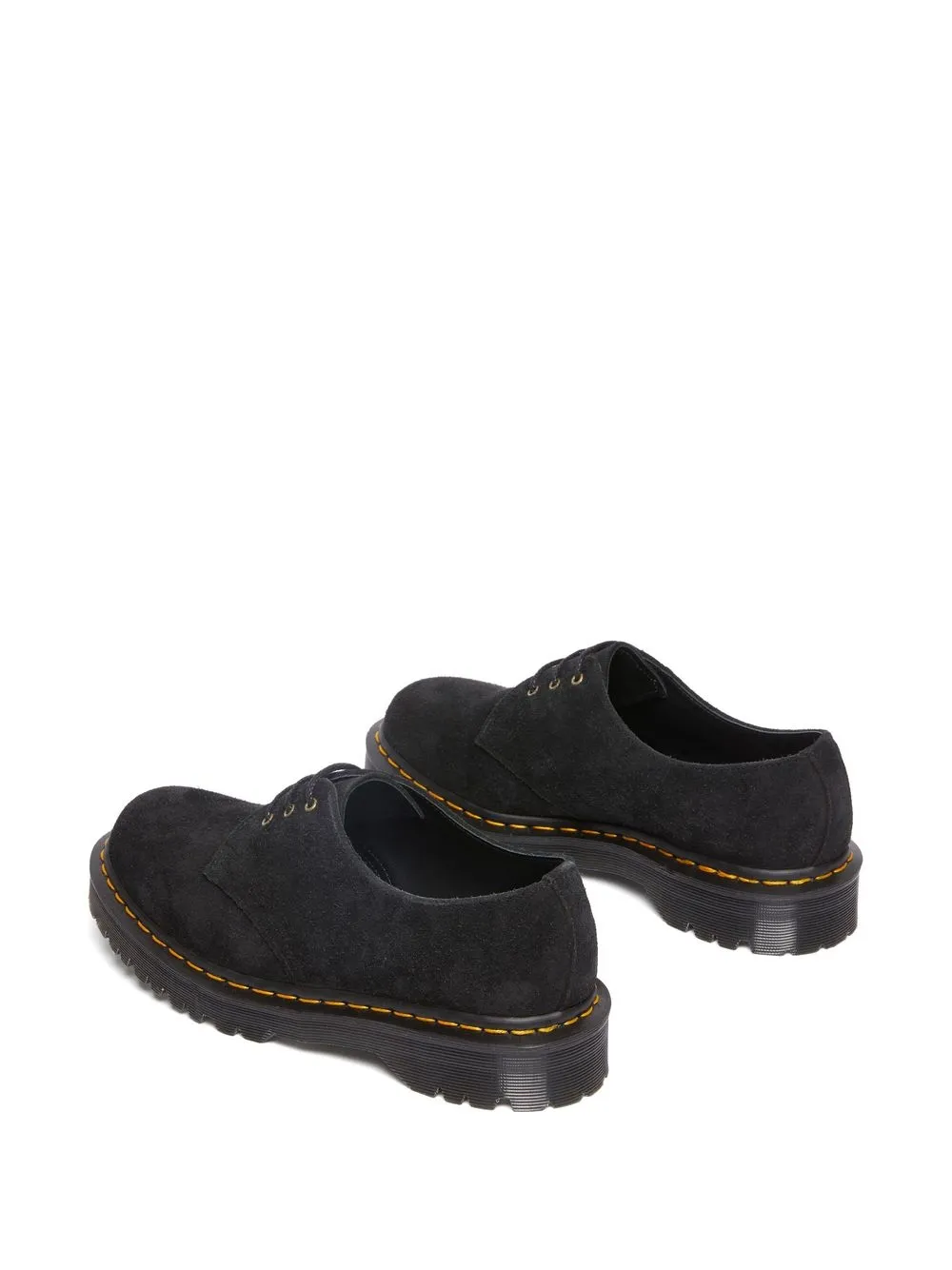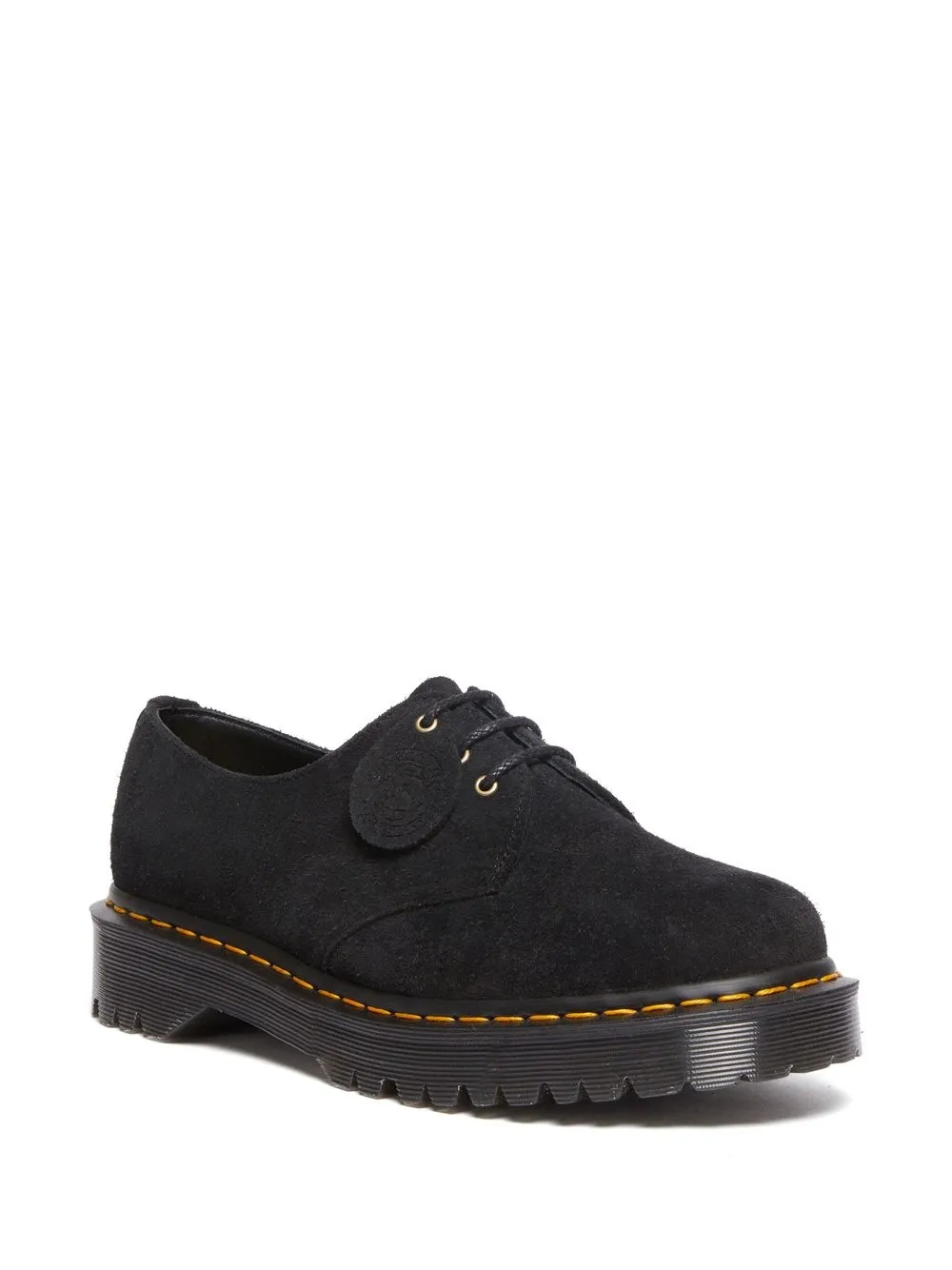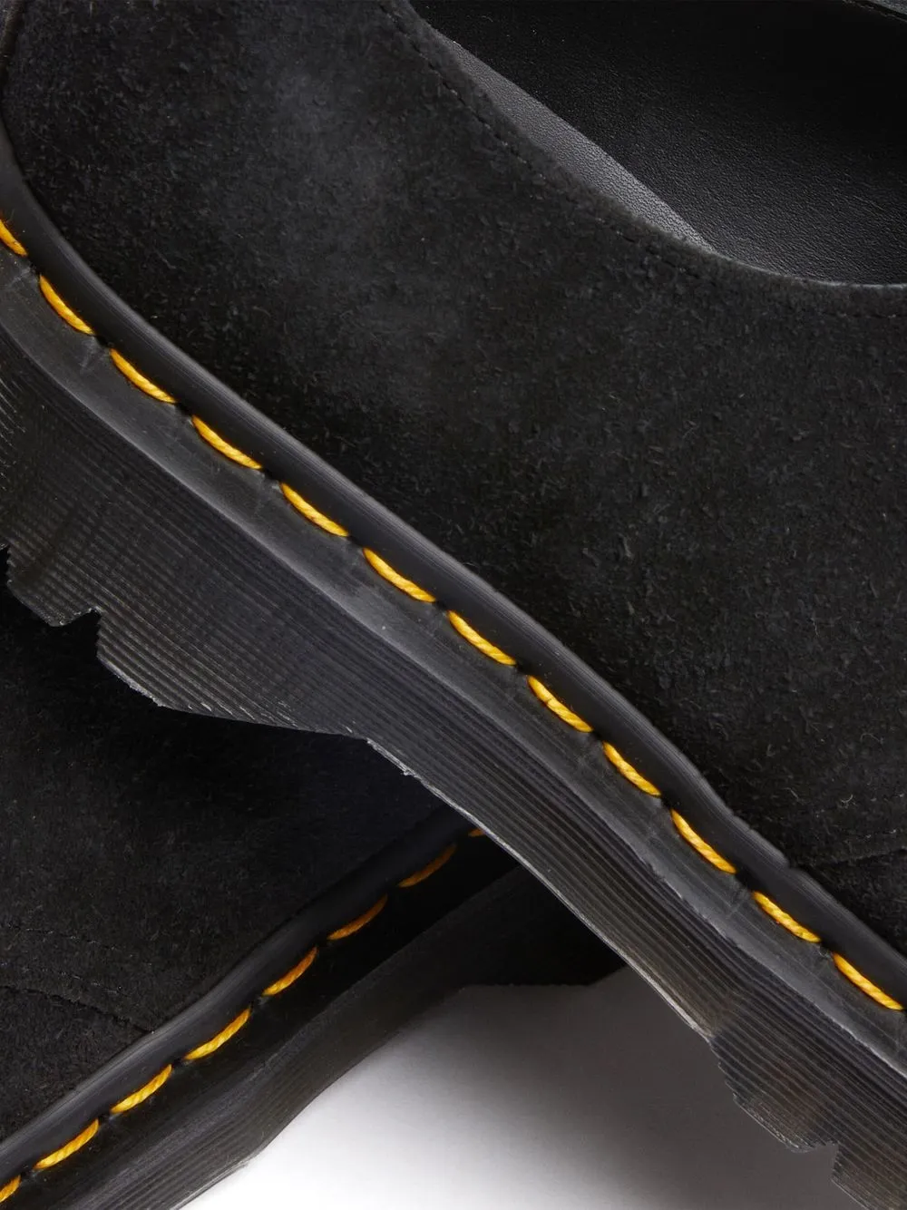 lace-up suede derby shoes from DR. MARTENS featuring jet black, suede, contrast stitching, front lace-up fastening, round toe and chunky rubber sole.