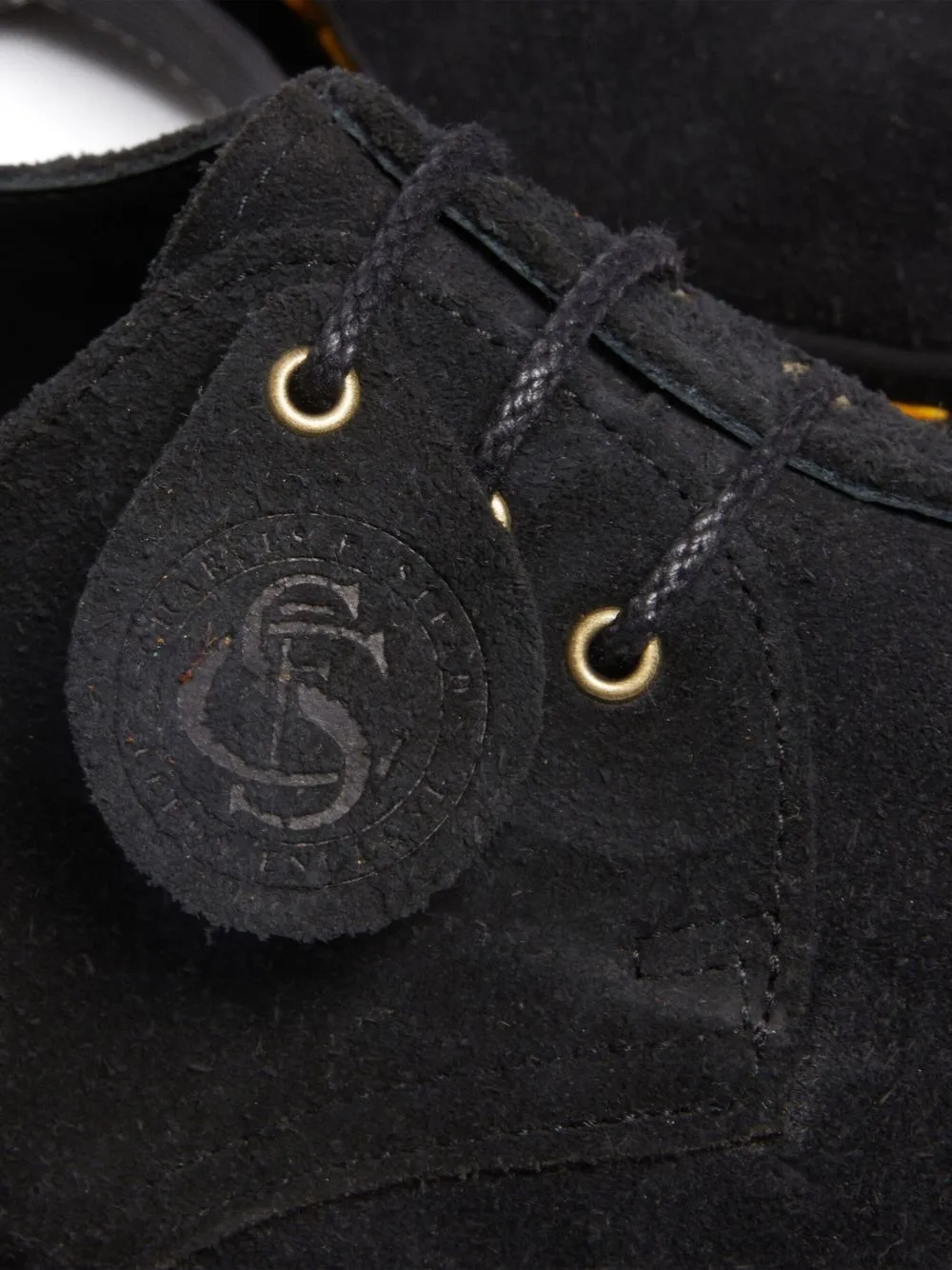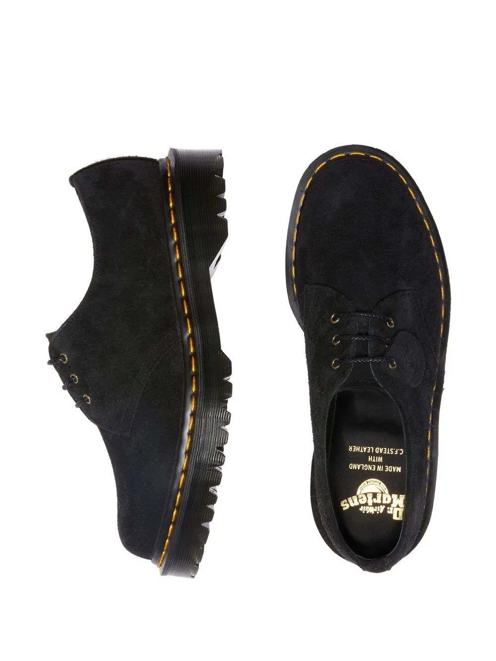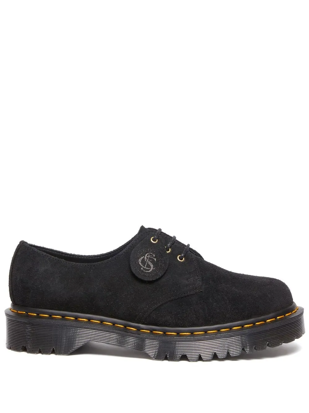 lace-up suede derby shoes from DR. MARTENS featuring jet black, suede, contrast stitching, front lace-up fastening, round toe and chunky rubber sole.