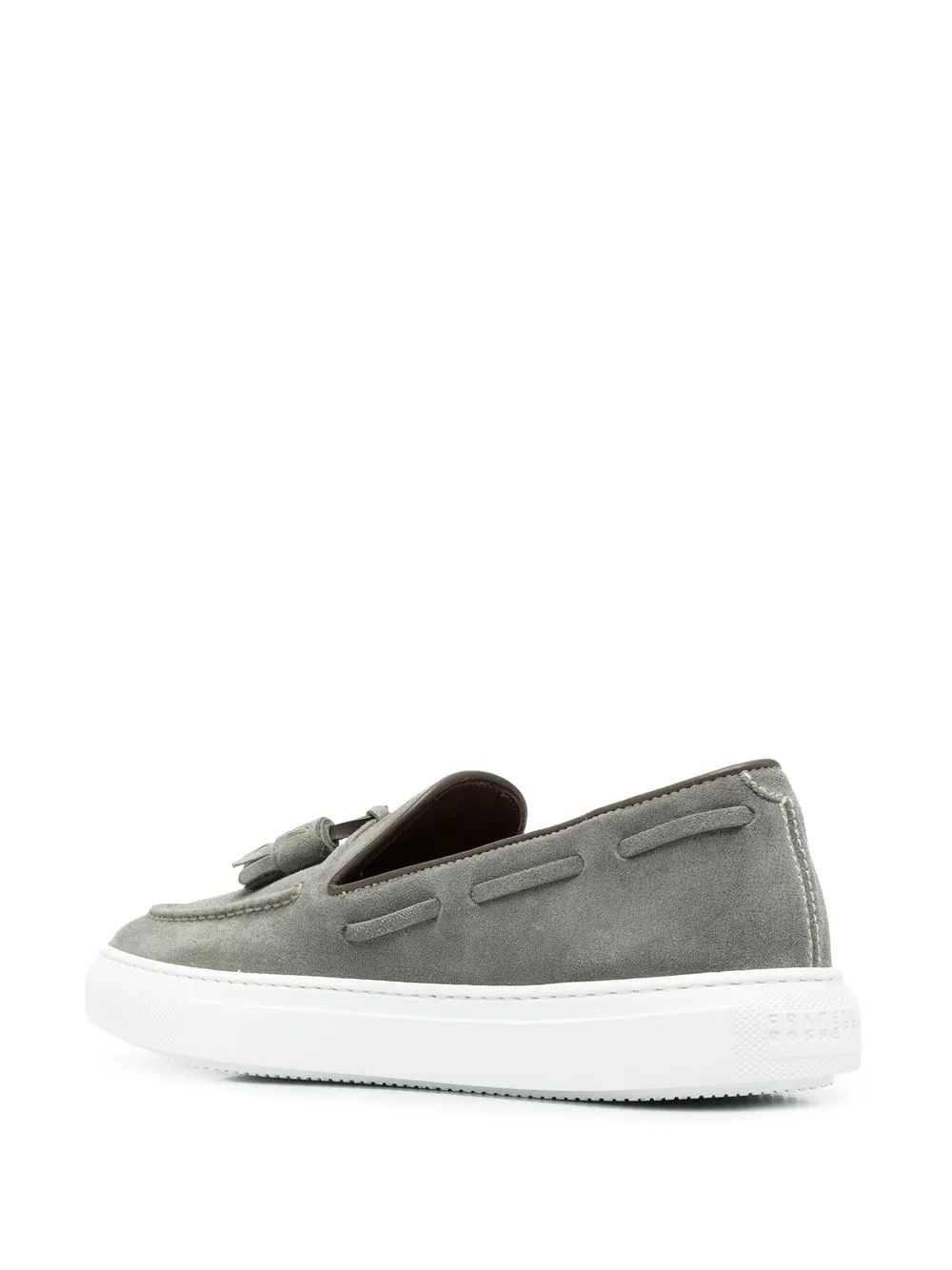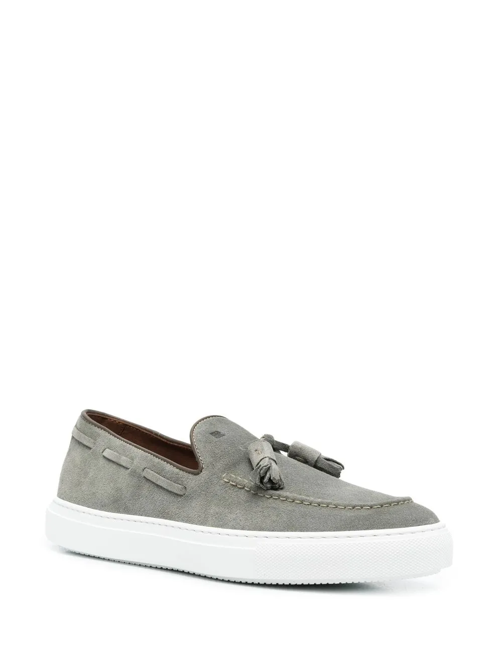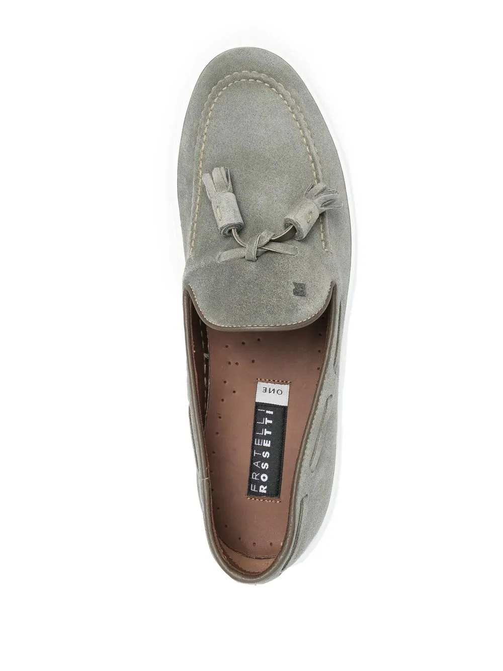 tassel-detail suede boat shoes from FRATELLI ROSSETTI featuring sage green, calf leather, tassel detail, tonal stitching, round toe, branded leather insole, flat rubber sole and slip-on style.