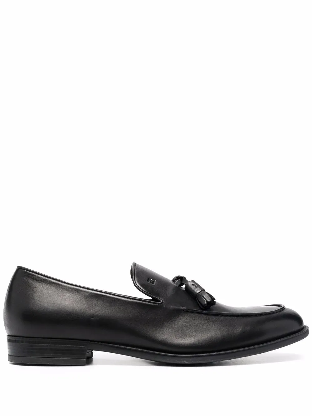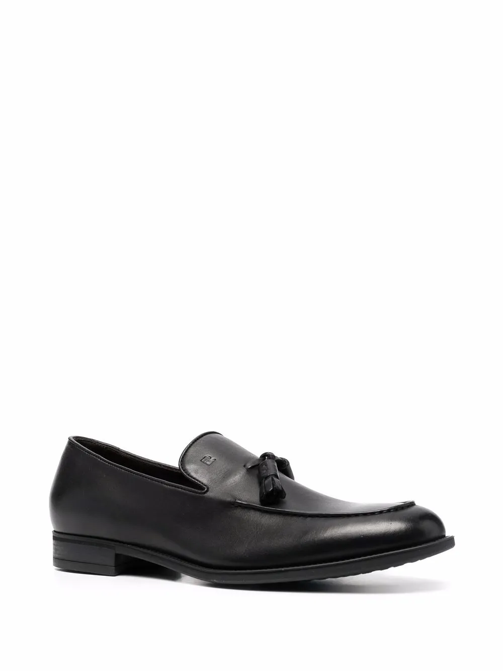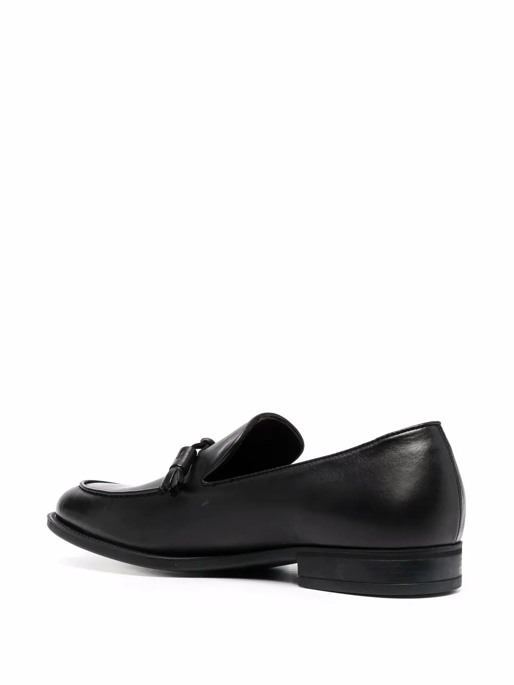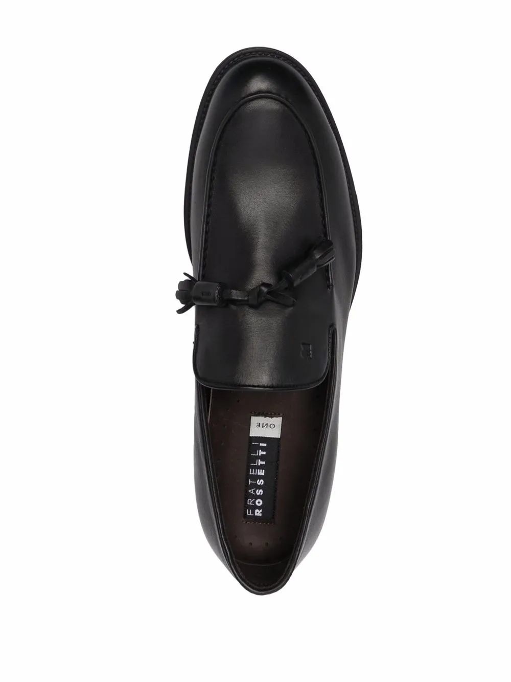 Black leather tassel-detailed leather loafers from FRATELLI ROSSETTI featuring high-shine finish, tassel detail, almond toe, slip-on style, branded insole and flat rubber sole.