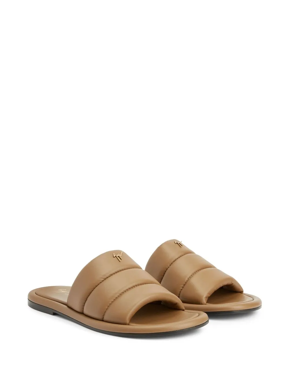 Harmande quilted leather slides from Giuseppe Zanotti featuring walnut brown, leather, quilted panels, gold-tone logo plaque, open toe, branded leather insole, flat sole and slip-on style.