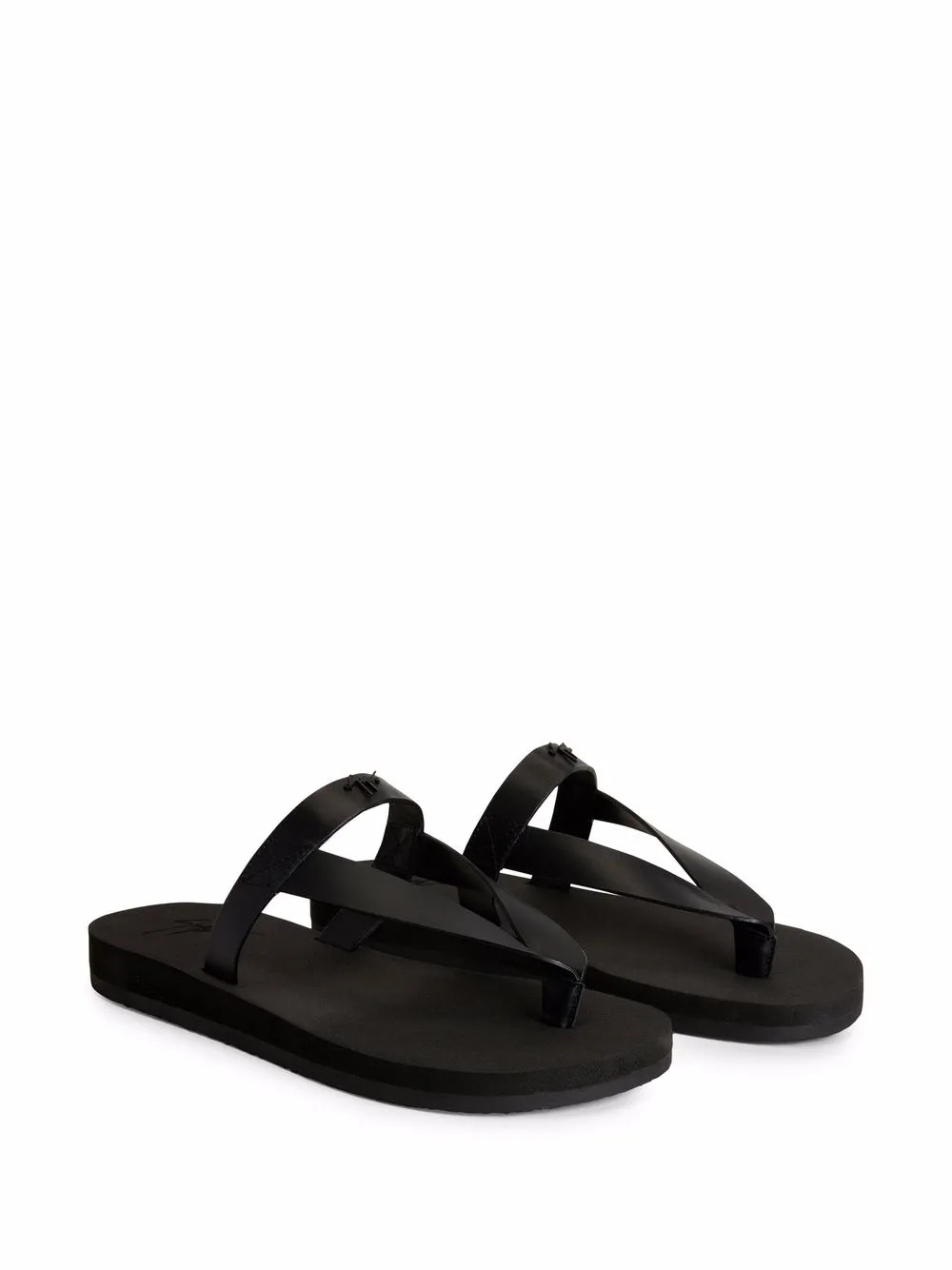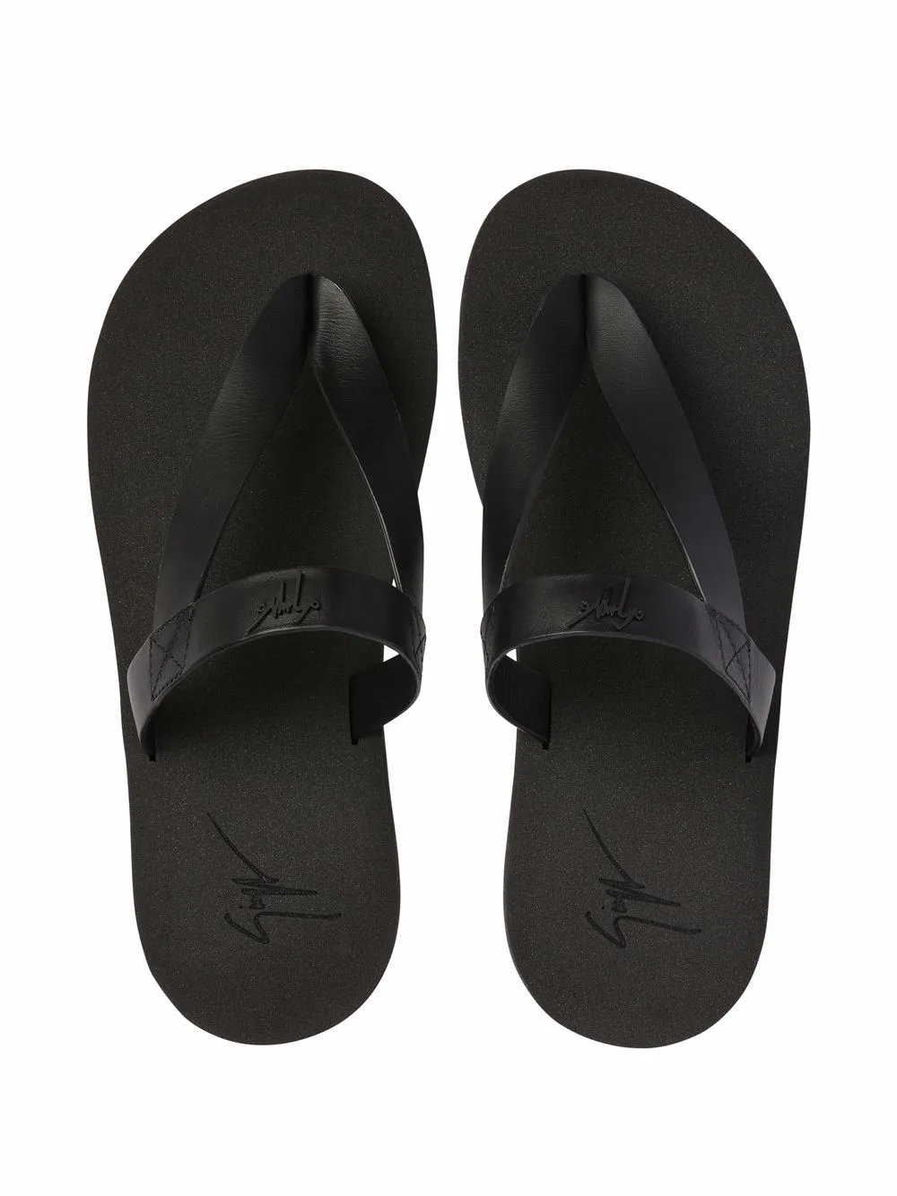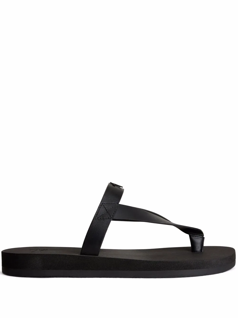 Black leather Hydra thong-strap leather sandals from Giuseppe Zanotti featuring logo patch to the front, thong strap, cut-out detailing, slip-on style and flat rubber sole.