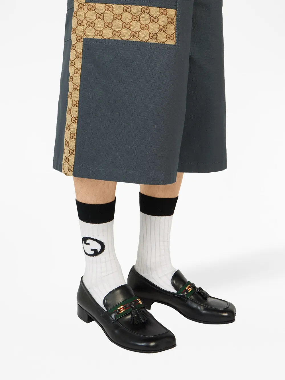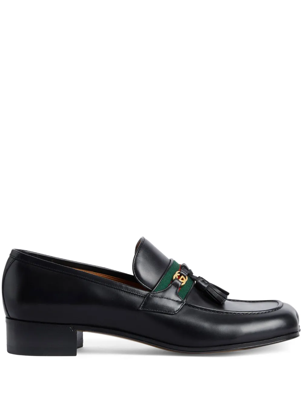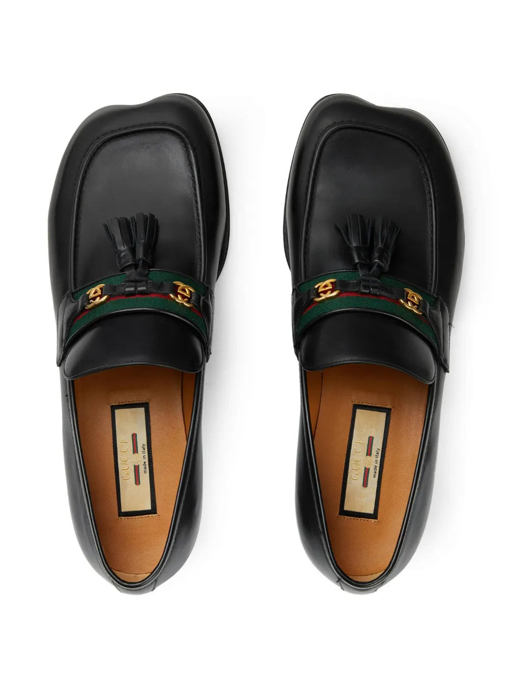 For SS23, Gucci combines distinctive shapes with unexpected details for its footwear collection. These moccasins feature a tassel trims at the uppers with unique curve which traces the silhouette of the foot, while the Interlocking G logo plaque and Web Stripe trim adds a signature finish.