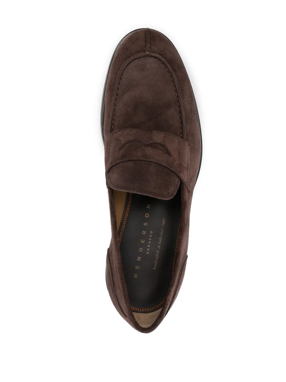 round-toe suede loafers from HENDERSON BARACCO featuring chocolate brown, calf suede, tonal stitching, penny slot, round toe, branded leather insole and flat leather sole.