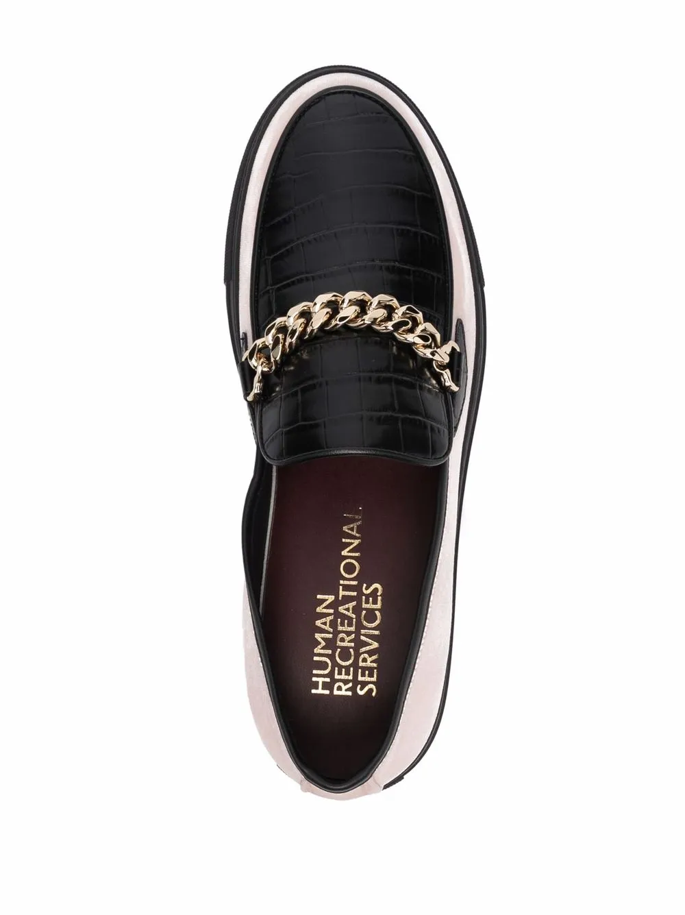 Black/light pink leather chain-link detail loafers from HUMAN RECREATIONAL SERVICES featuring colour-block panelled design, chain-link detailing, round toe, branded insole and flat rubber sole.