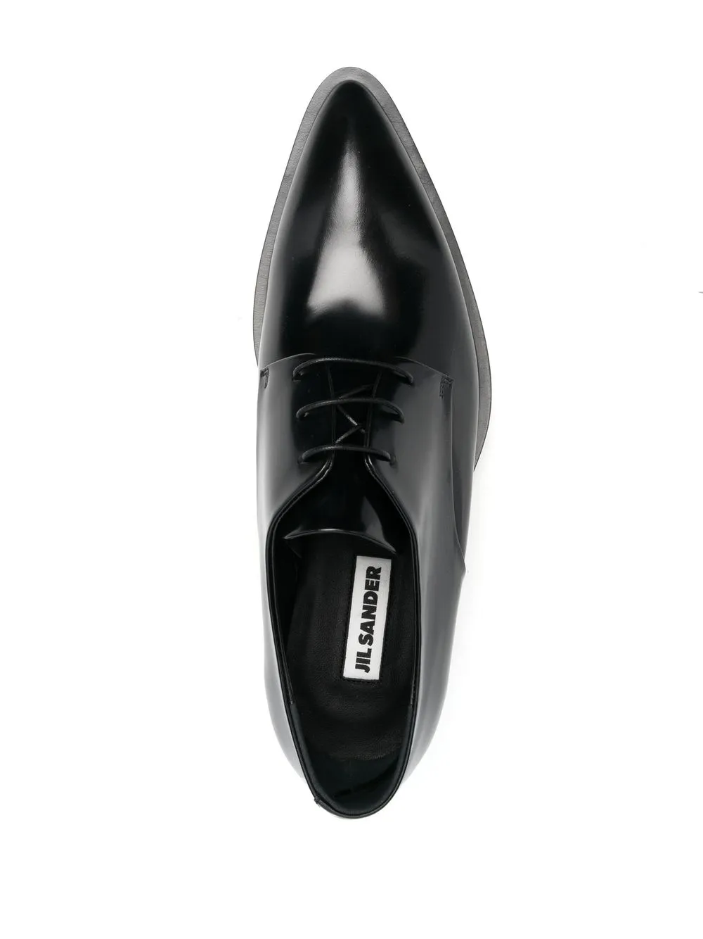 lace-up Derby shoes from JIL SANDER featuring black, calf leather, polished finish, branded insole, pointed toe, front lace-up fastening, low block heel and ridged rubber sole.