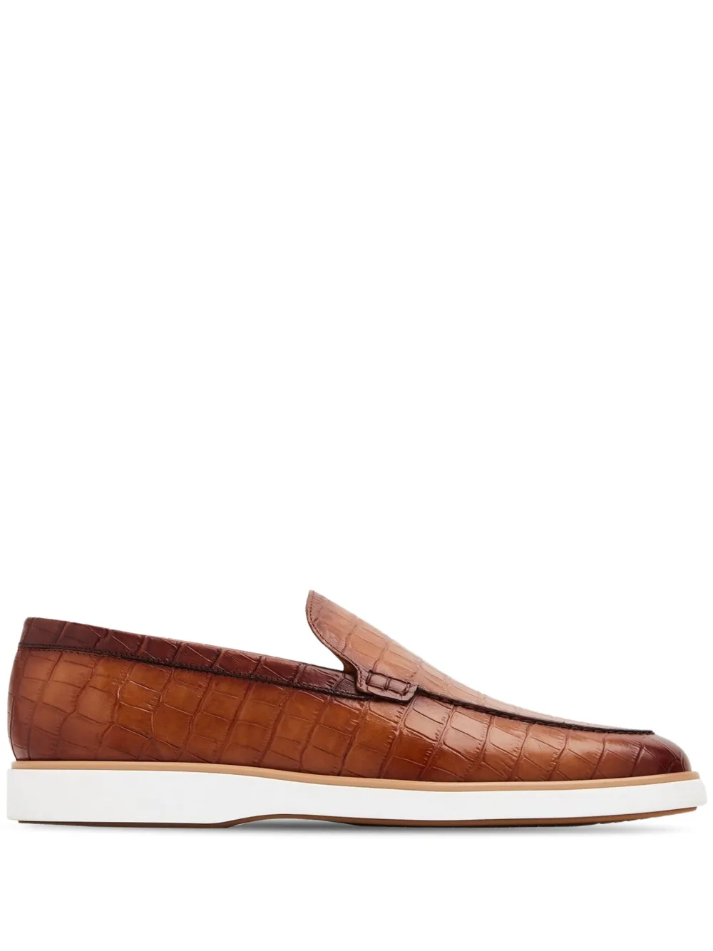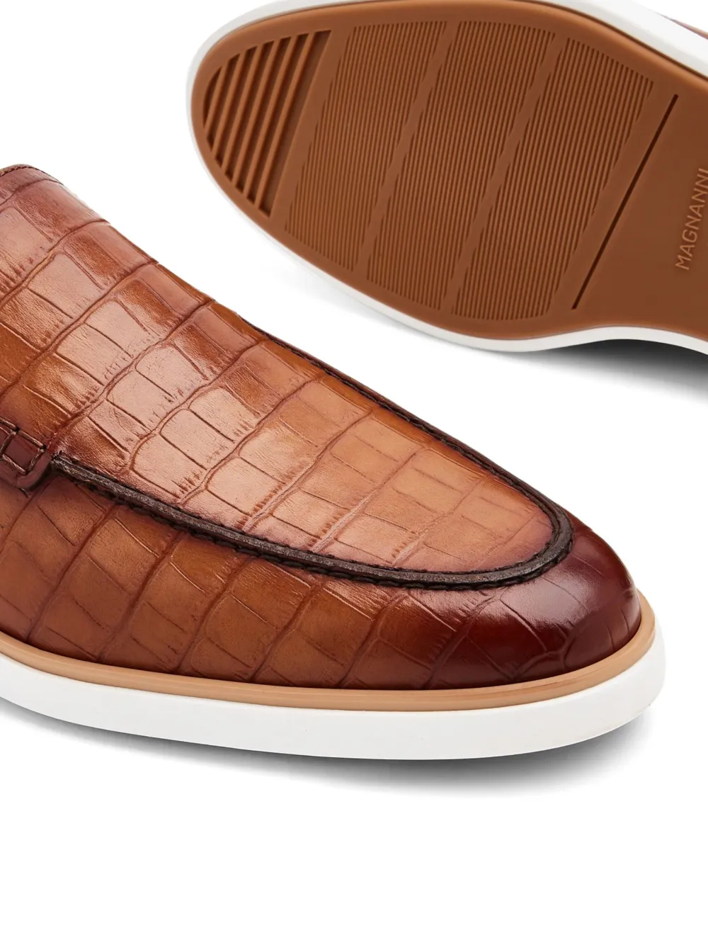 crocodile-effect leather loafers from MAGNANNI featuring cognac brown, calf leather, gradient effect, embossed crocodile effect, almond toe, branded insole, rubber sole and slip-on style.