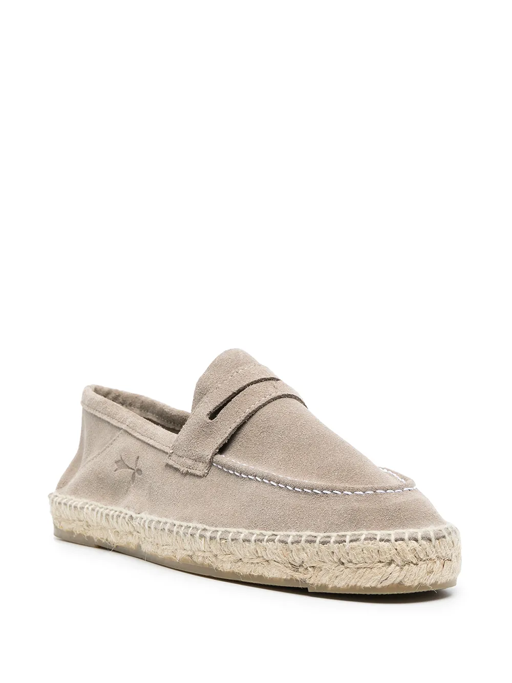 Taupe suede Hamptons espadrilles from MANEBI featuring round toe, branded insole, slip-on style and braided esparto rope sole.