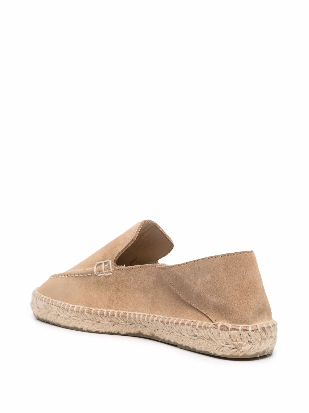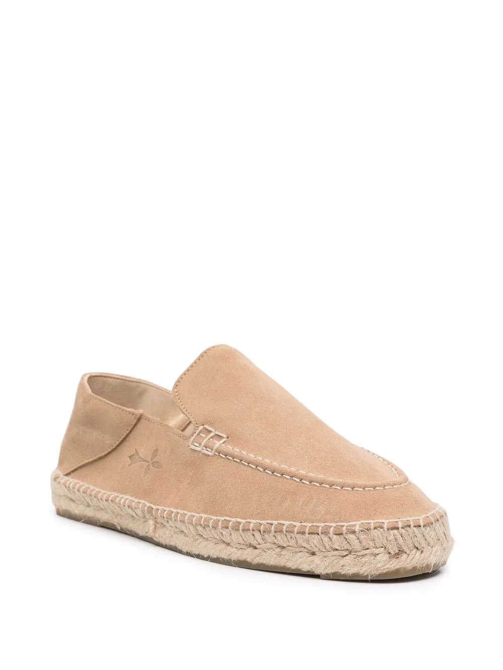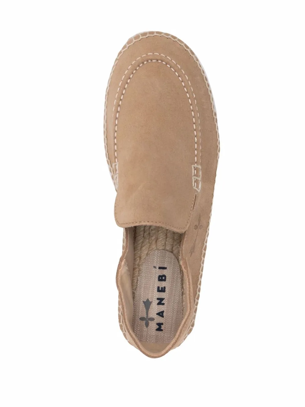 Washed beige leather-suede blend Hamptons suede espadrilles from Manebi featuring decorative stitching, embossed logo to the side, slip-on style, branded insole, braided raffia sole and rubber sole.