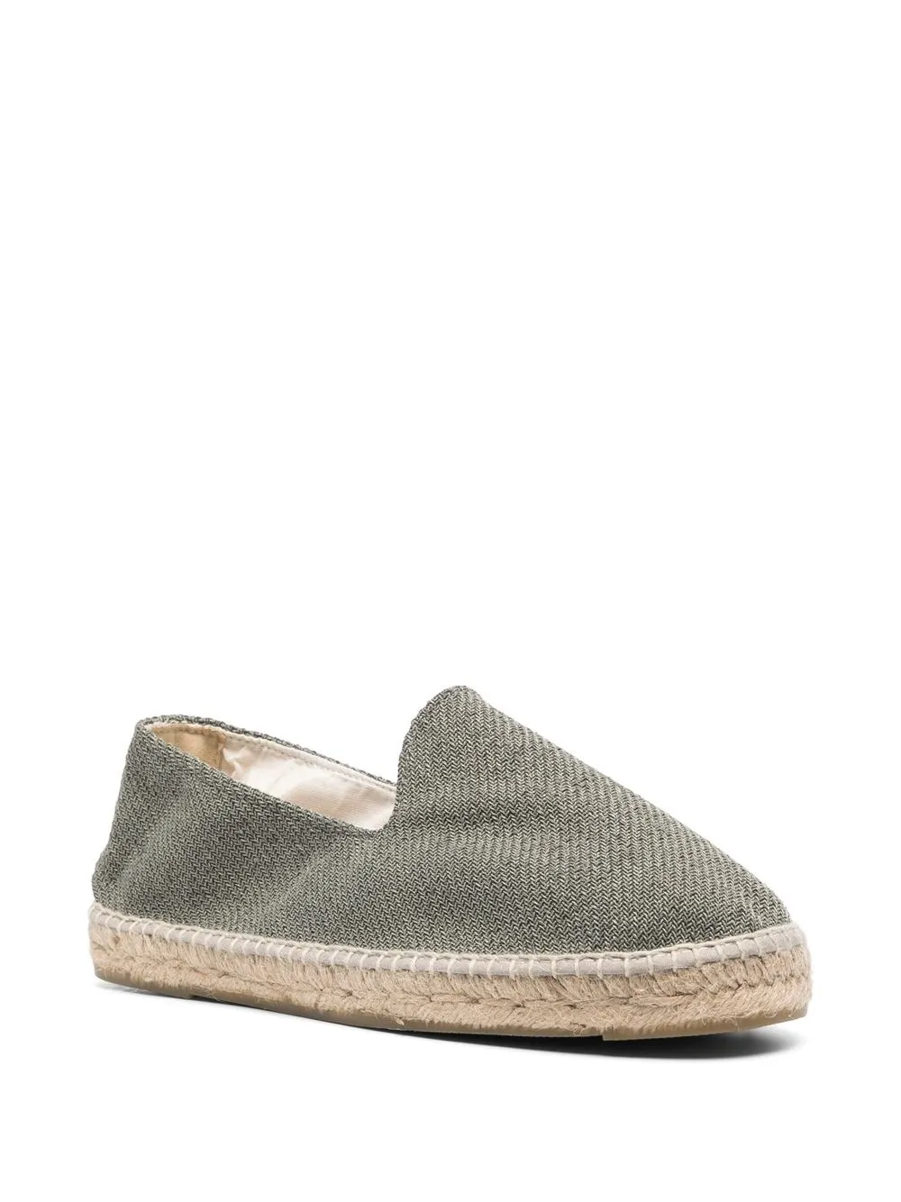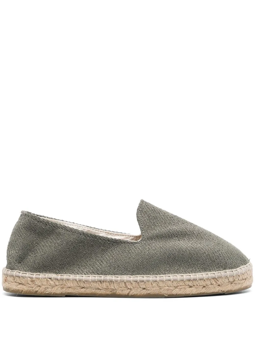 jute-sole espadrilles from MANEBI featuring khaki, contrast stitching, jute sole, branded footbed, round toe and slip-on style.