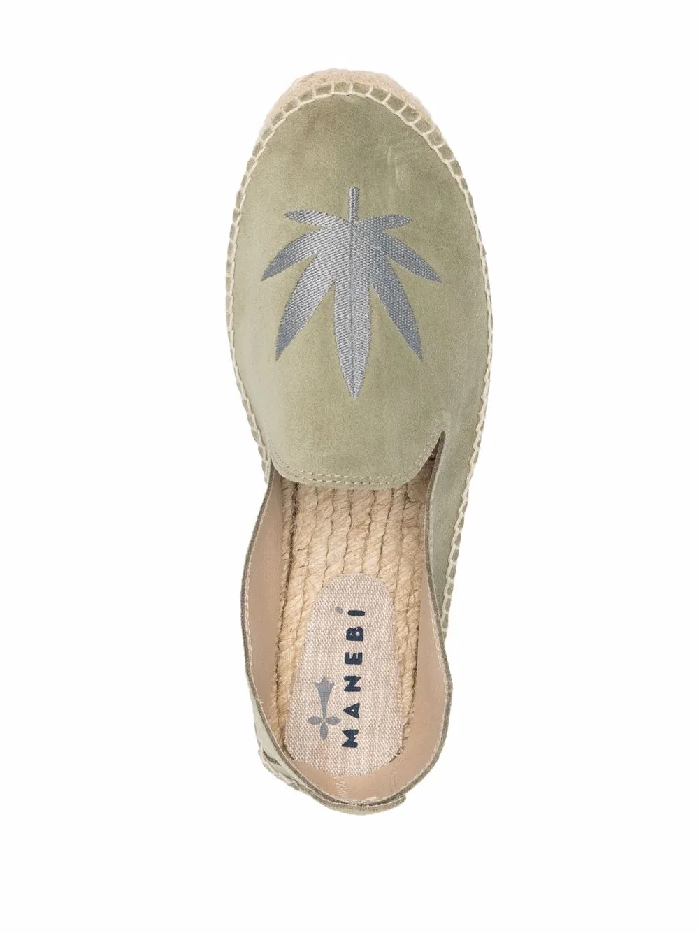 Military green/carbon grey leather Palm Springs embroidered espadrilles from MANEBI featuring leaf embroidery, round toe, slip-on style, branded insole and flat sole.