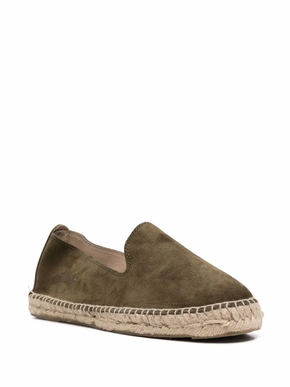 Green suede round toe espadrilles from MANEBI featuring braided raffia sole, slip-on style, round toe, flat sole and branded insole.