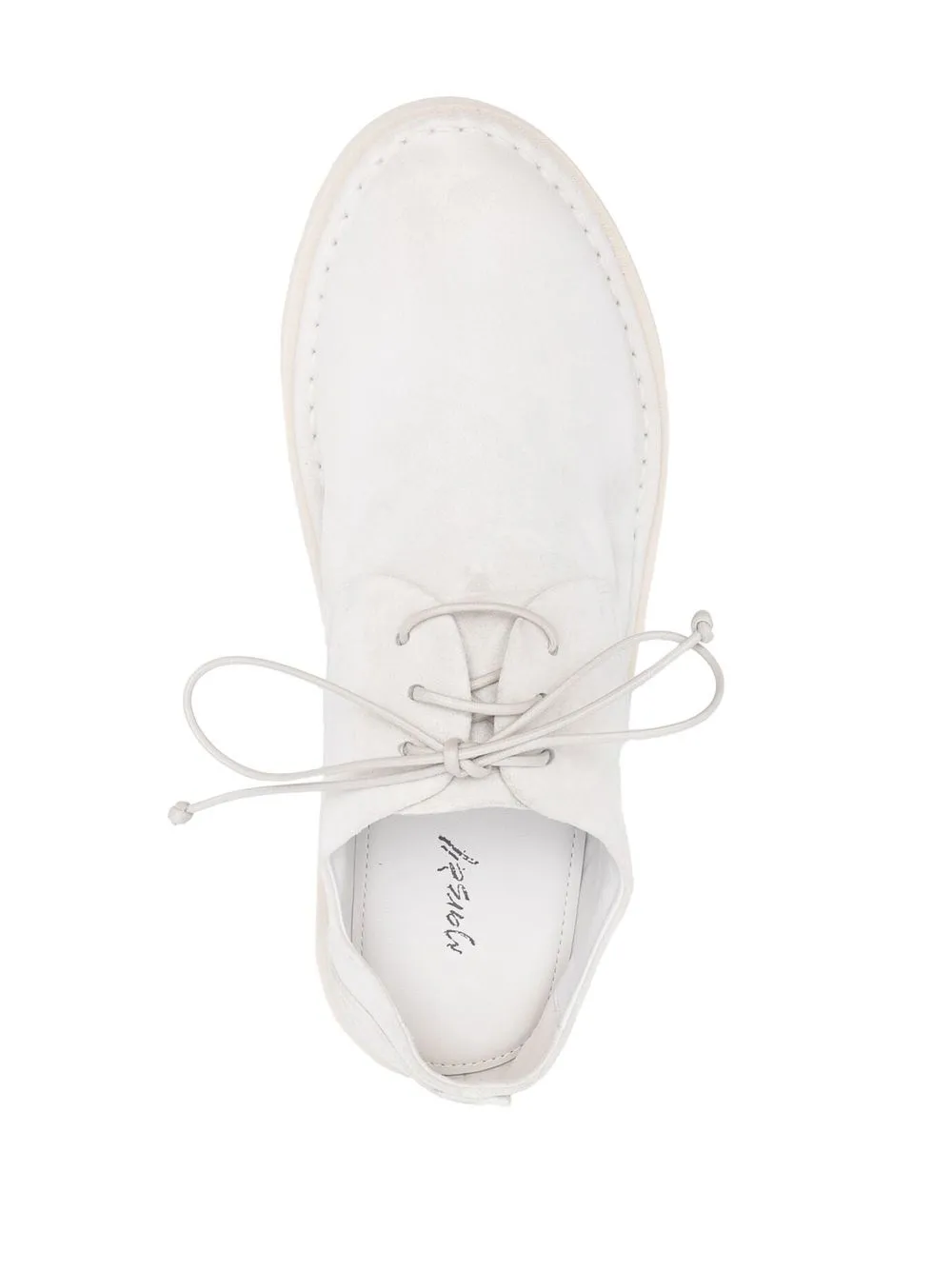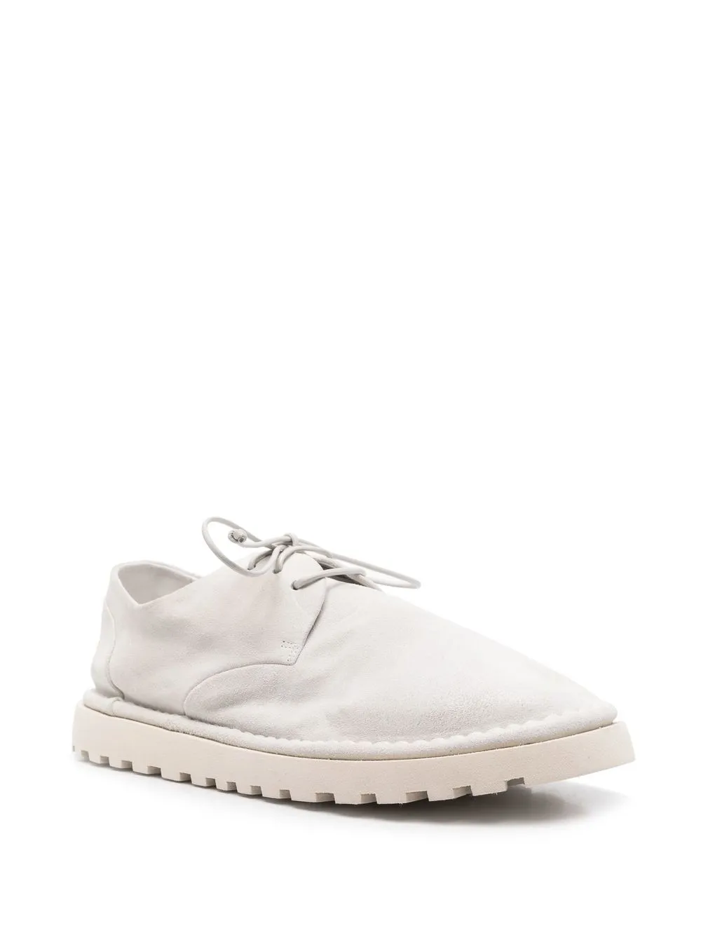 lace-up suede derby shoes from MARSÈLL featuring light beige, suede, leather lining, round toe, front lace-up fastening, branded insole and flat rubber sole.