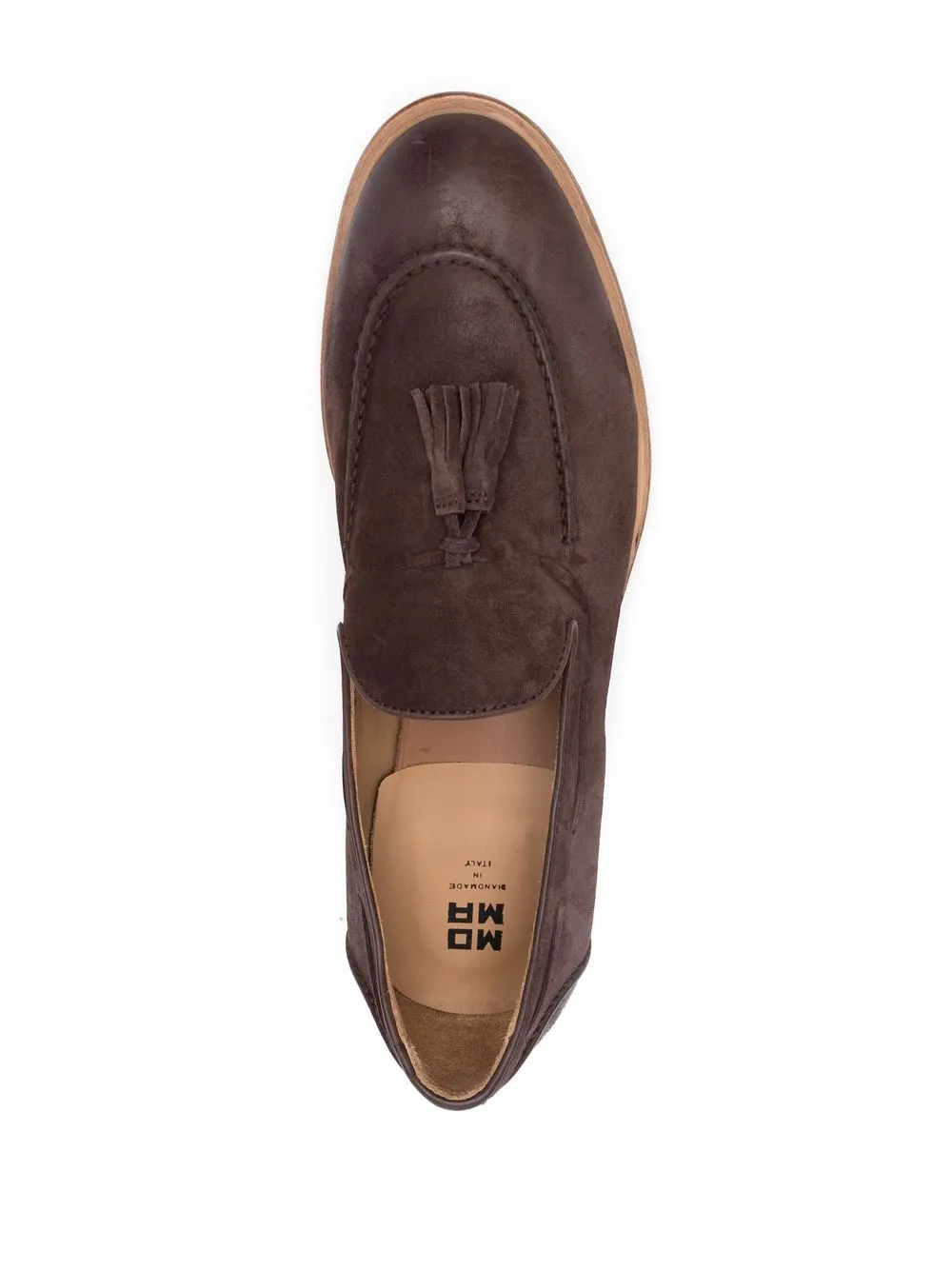 tassel-detail moccasin loafers from MOMA featuring chocolate brown, calf suede, tassel detail, apron toe, round toe, slip-on style and flat rubber sole.