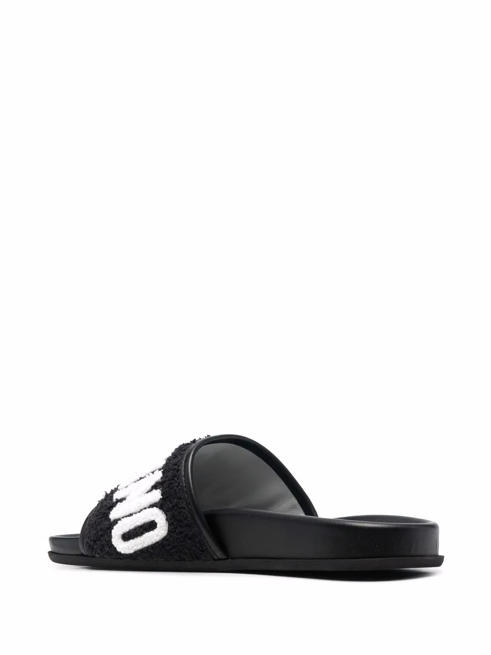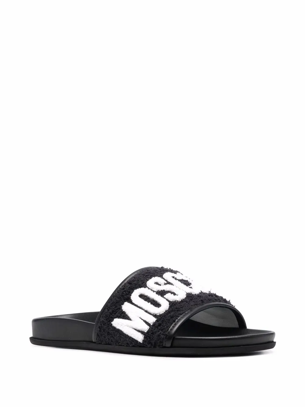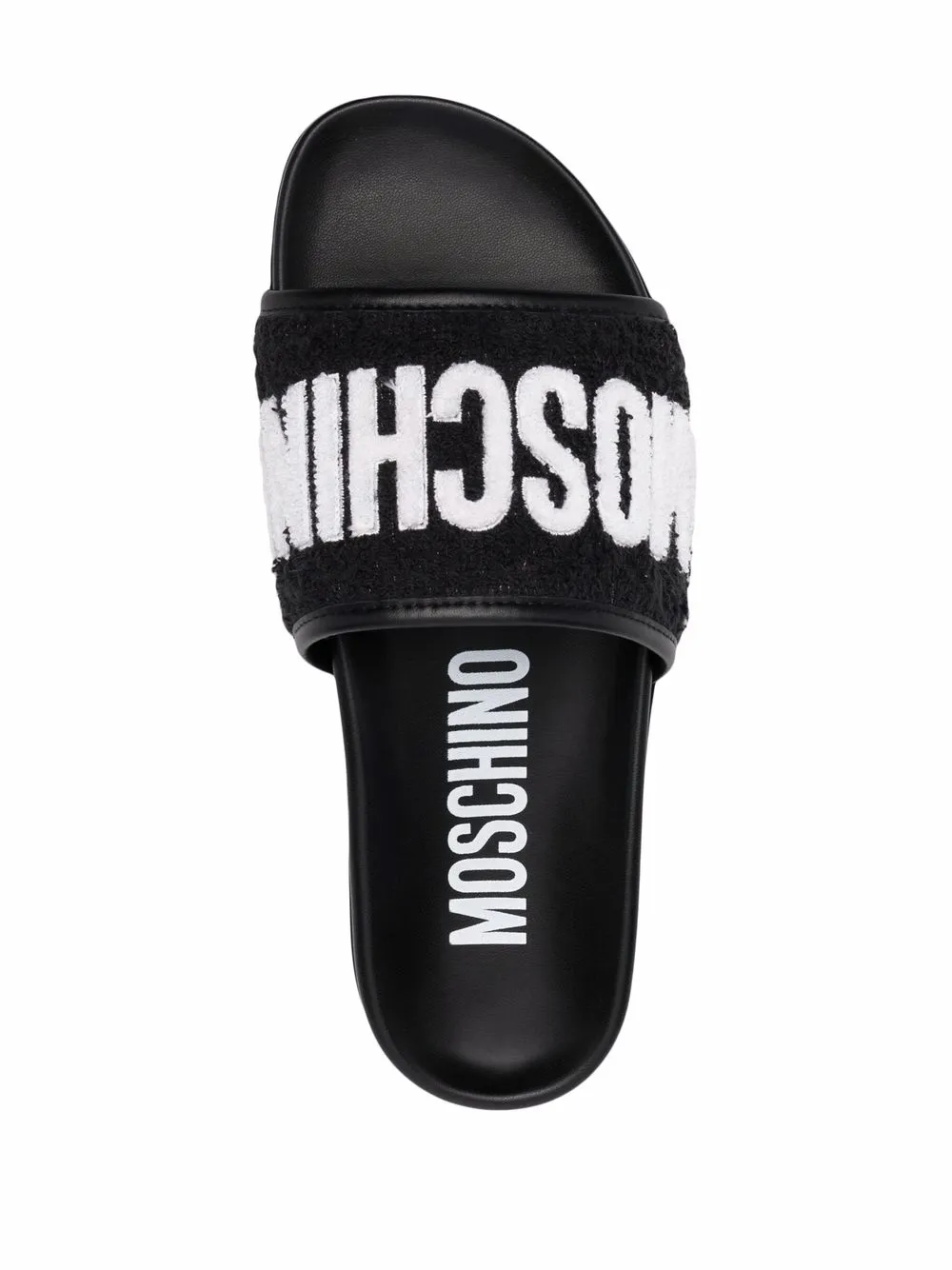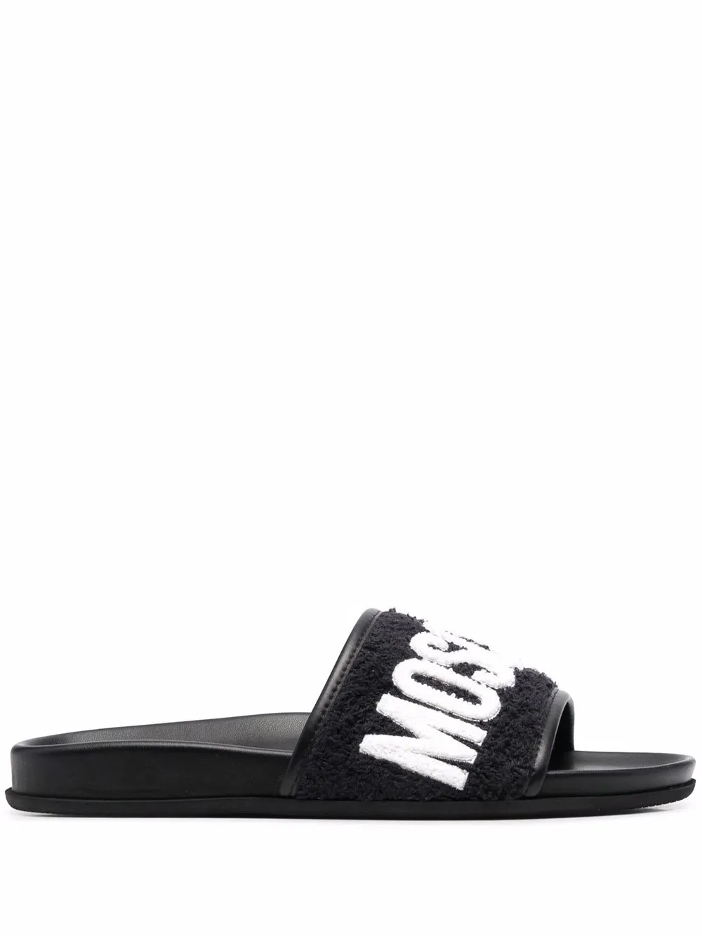 Black/white leather logo-lettering leather slides from MOSCHINO featuring terry-cloth effect, logo lettering, open toe, slip-on style, moulded footbed, branded insole and flat rubber sole.