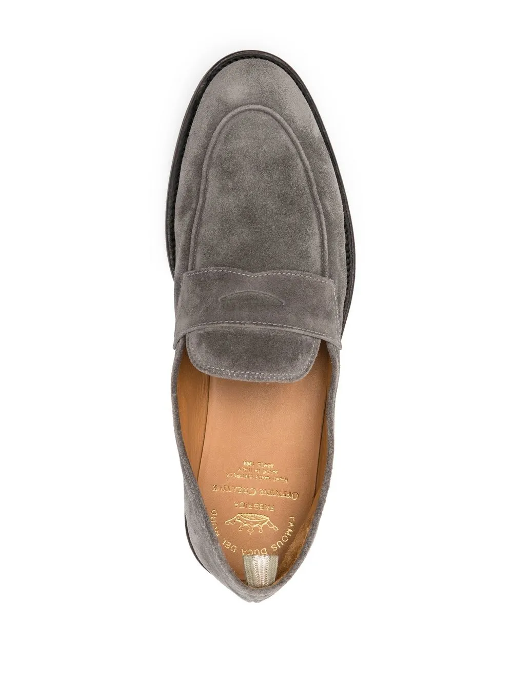 Opera suede Penny loafers from OFFICINE CREATIVE featuring grey, calf suede, calf leather, slip-on style, almond toe, penny slot, branded leather insole, pull-tab at the heel and flat rubber sole.