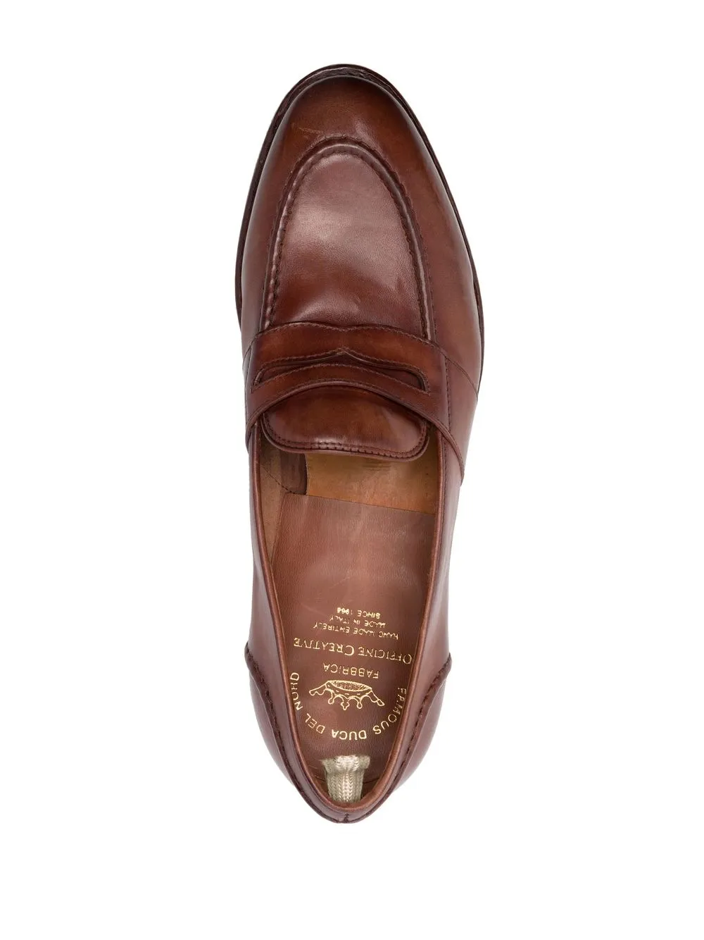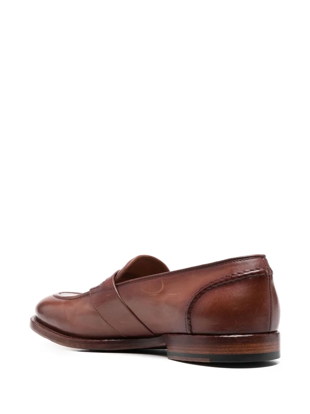 Temple leather Penny loafers from OFFICINE CREATIVE featuring brown, calf leather, penny slot, almond toe, almond toe, branded leather insole and flat rubber sole.