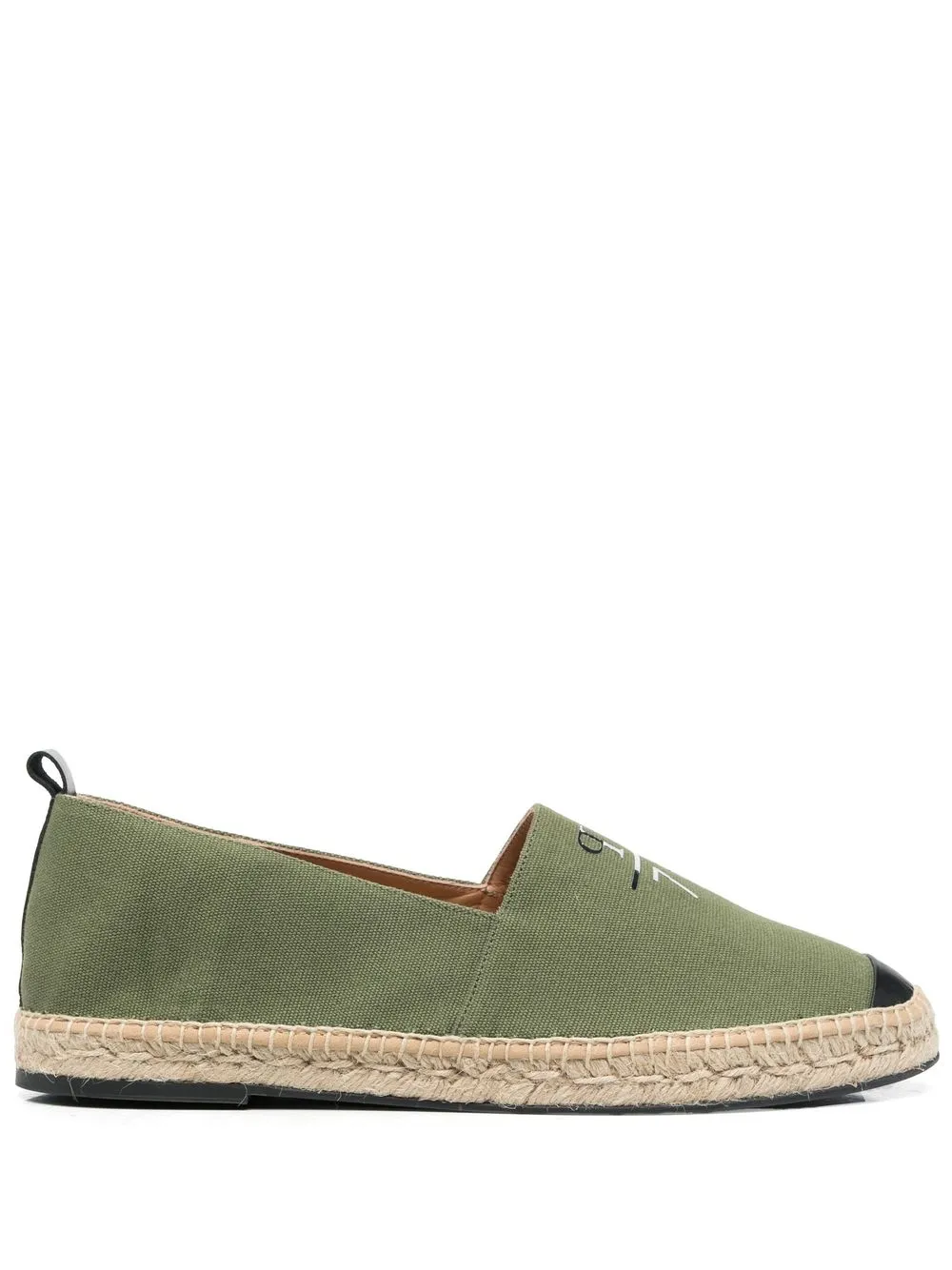 logo-print leather-trim espadrilles from PHILIPP PLEIN featuring military green, black, calf leather, logo print to the front, round toe, leather trim, pull-tab at the heel, slip-on style, branded insole and braided raffia sole.