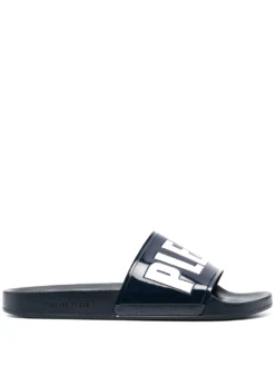 Black/white two-tone logo-print slides from PHILIPP PLEIN featuring two-tone design, logo print to the front, round toe and open toe.