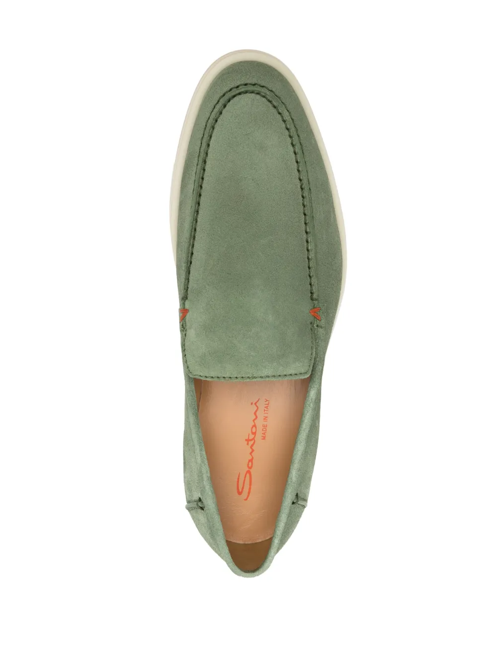 almond-toe loafers from SANTONI featuring light olive green, calf leather, tonal stitching, almond toe, slip-on style, branded insole and flat rubber sole.