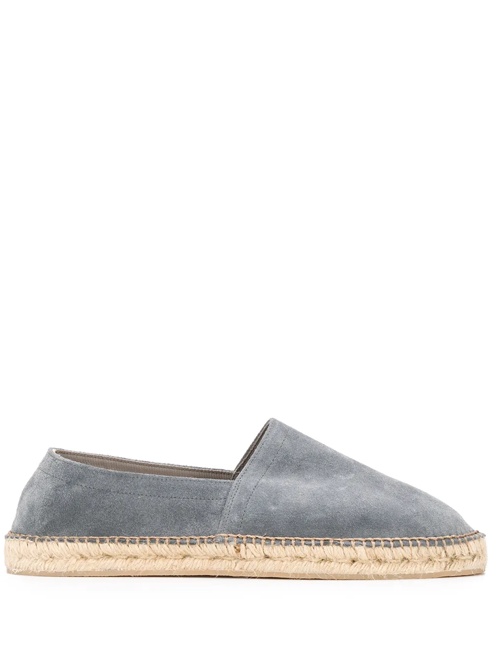 Medium grey suede Pablo plain espadrilles from Scarosso featuring round toe, slip-on style, branded insole and braided raffia sole.