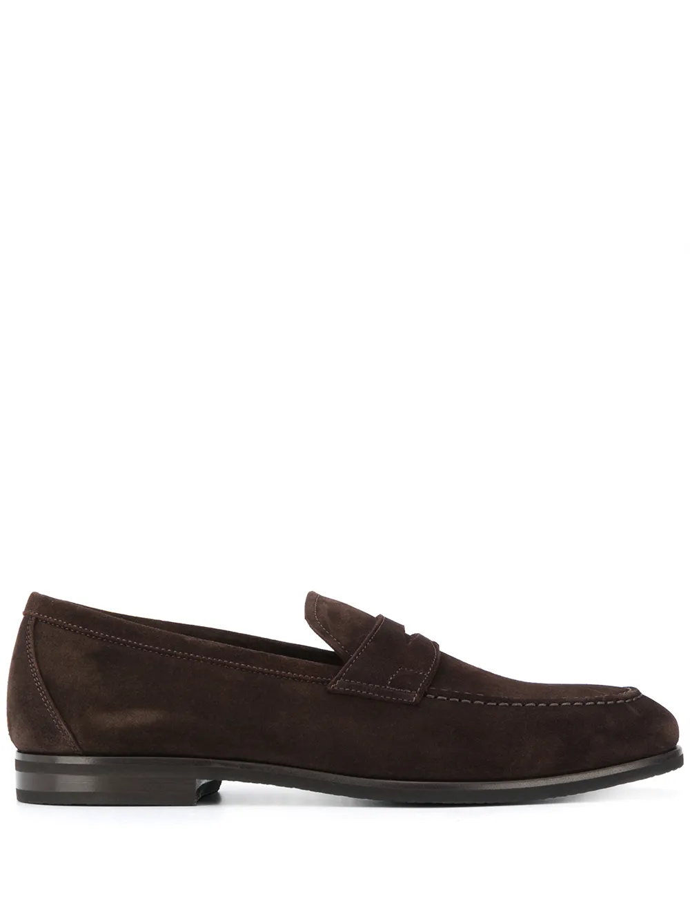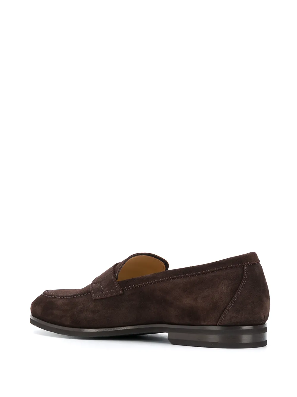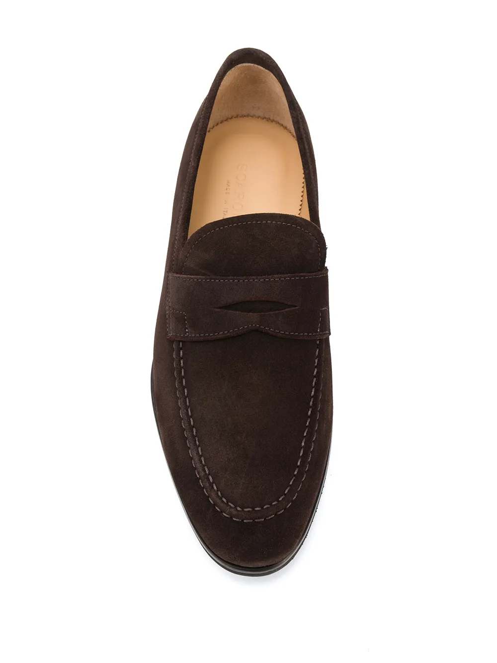 Dark brown calf leather Renato almond toe loafers from Scarosso featuring almond toe, slip-on style, branded insole, low heel and rubber sole.