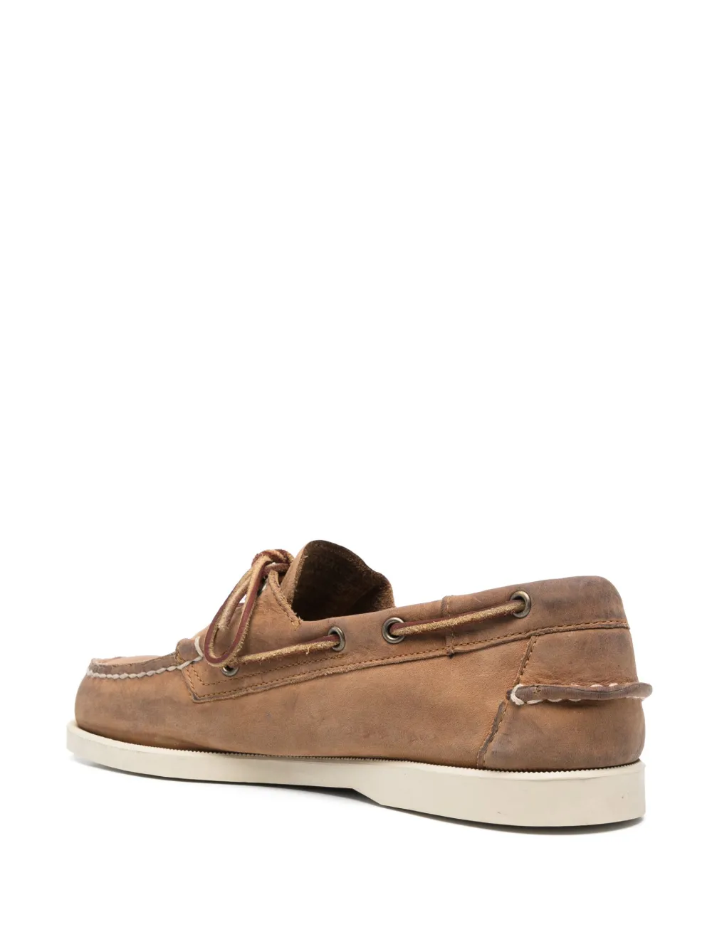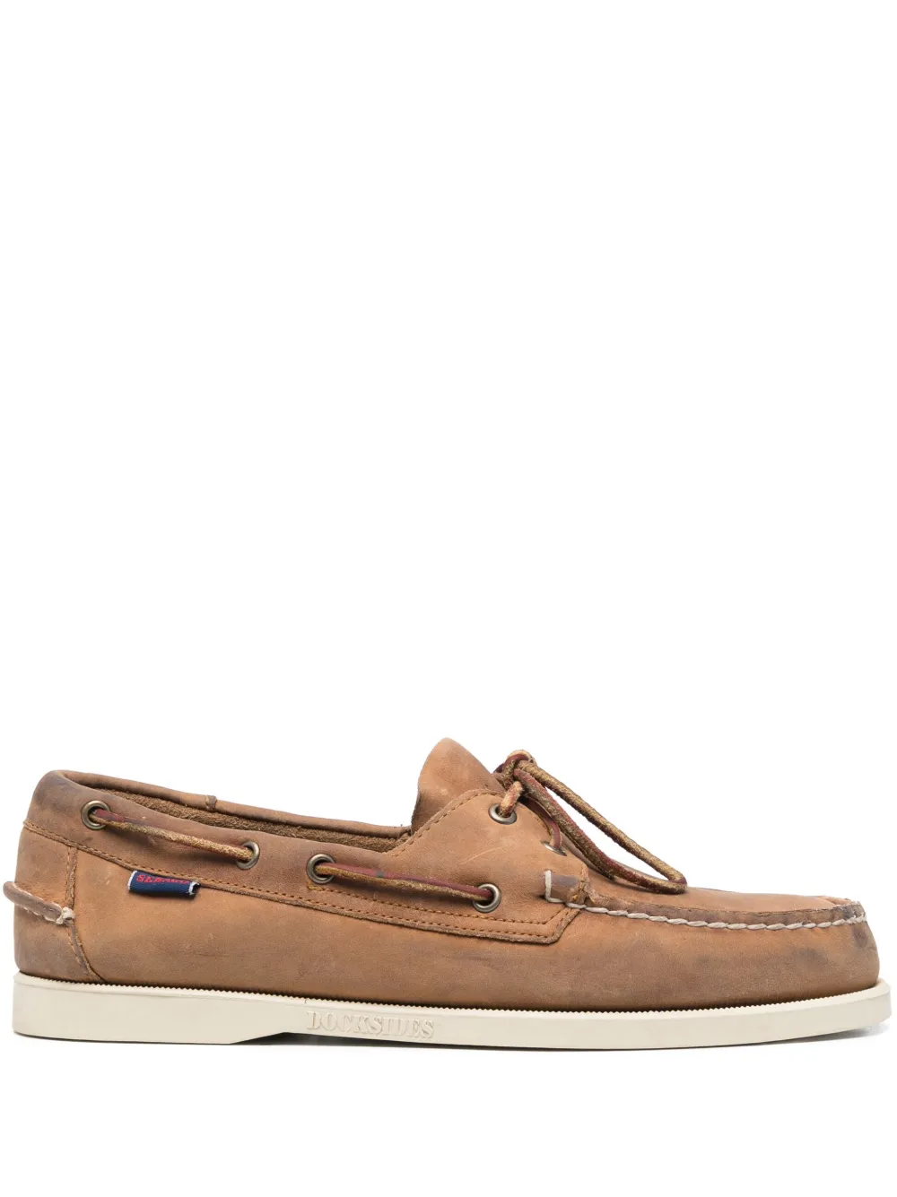 casual lace-up boat shoes from SEBAGO featuring camel brown, calf leather, seam detailing, round toe, front lace-up fastening, branded leather insole and flat rubber sole.