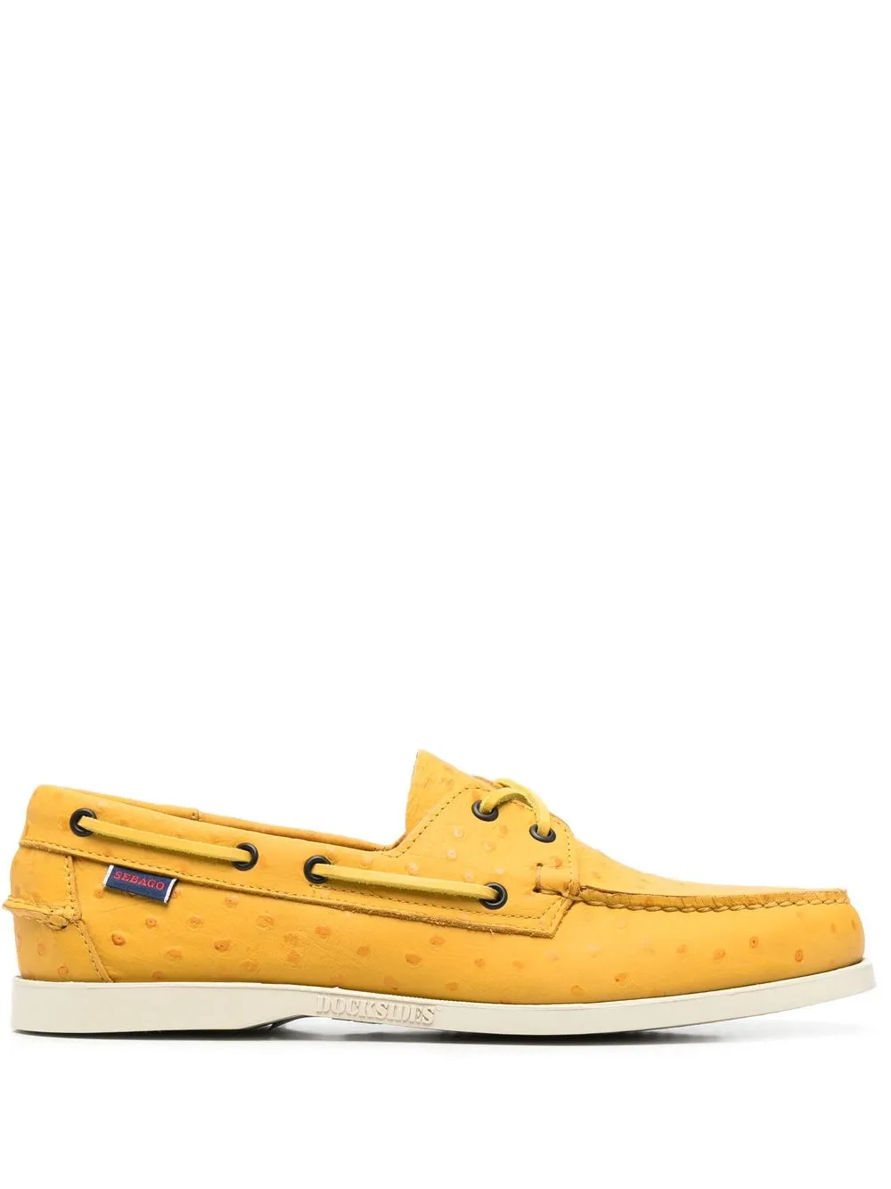 logo-embossed boat shoes from SEBAGO featuring yellow, suede, leather, embossed logo to the side, logo patch to the side, round toe, front lace-up fastening, branded insole and flat sole.