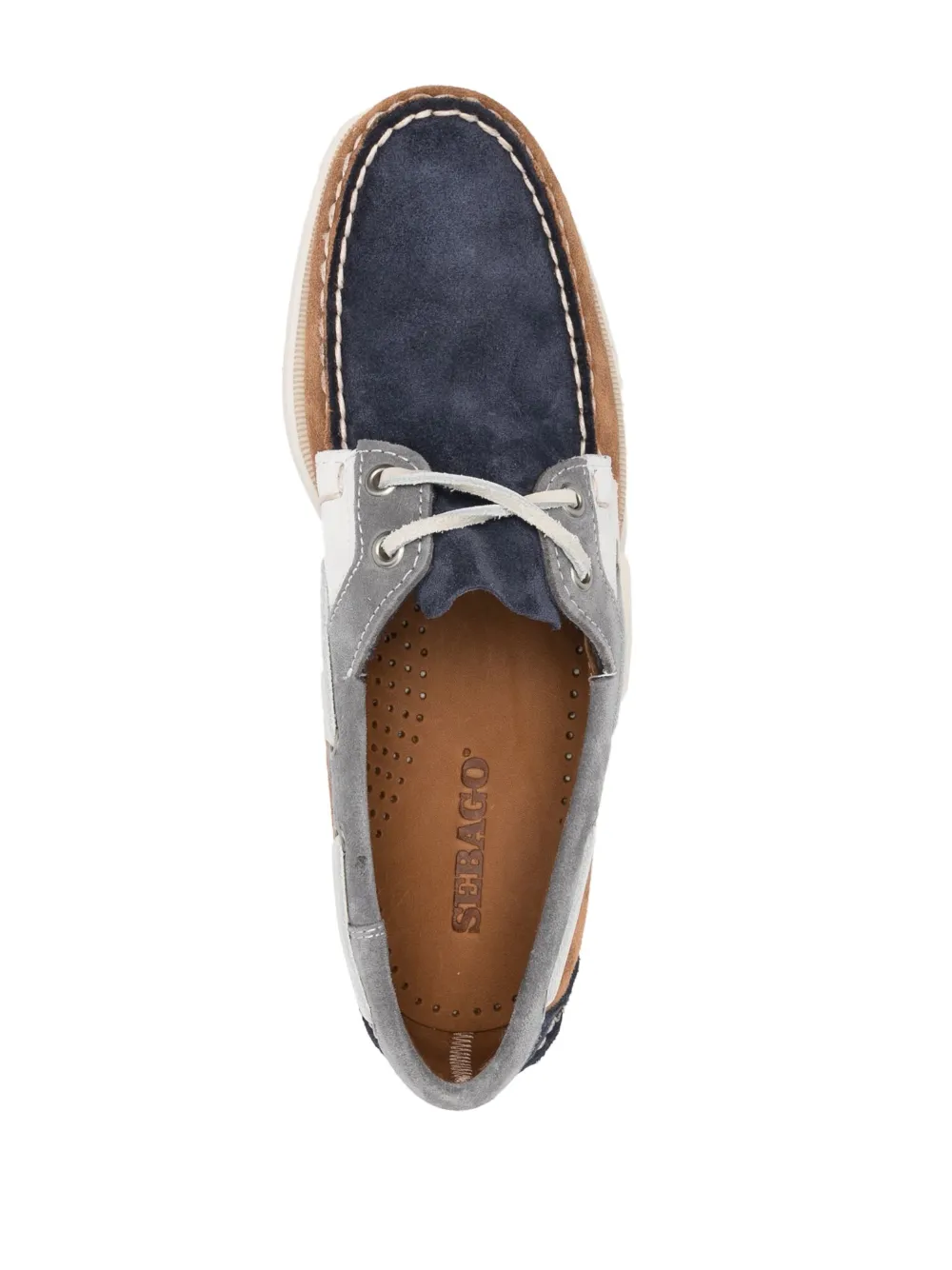 Rossisland suede boat shoes from SEBAGO featuring decorative stitching, logo patch to the side, slip-on style, cognac blue/brown/grey, calf leather/calf suede, round toe, branded insole and rubber sole.