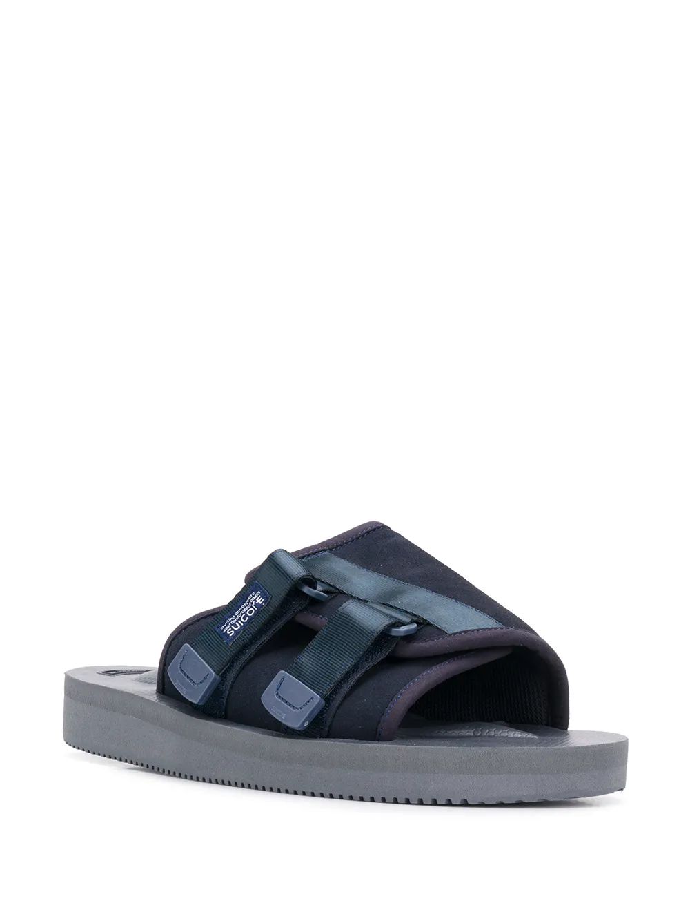 Navy blue double strap slides from Suicoke featuring a touch strap fastening, a molded footbed and a branded insole. This item is unisex.