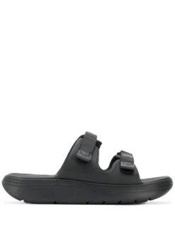 Black touch strap flip flops from Suicoke featuring a PVC design, an open top design and a flat rubber sole.