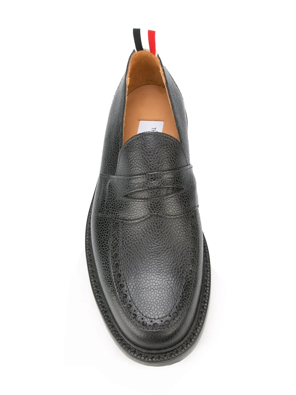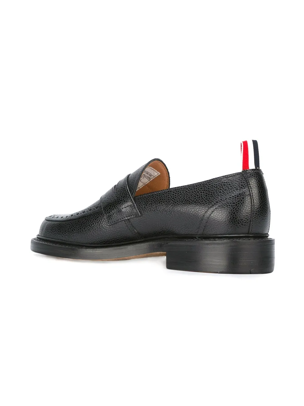 When tradition impacts as much as innovation, Thom Browne excels in perfectly balancing prominent characteristics with unforeseen modifications. The casual model to a well-thought ensemble, classic loafers certainly never go out of style. With a pull tab replaced with Browne’s remarkable signature red, white and navy blue stripe in grosgrain material, this pebble grained leather pair features a round toe, punch hole detailing and a slip-on style.