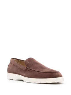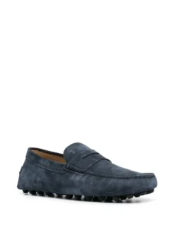 City Gommino driving shoes from TOD’S featuring beige, calf leather, almond toe, tonal stitching, debossed logo to the front, penny slot and flat rubber sole.
