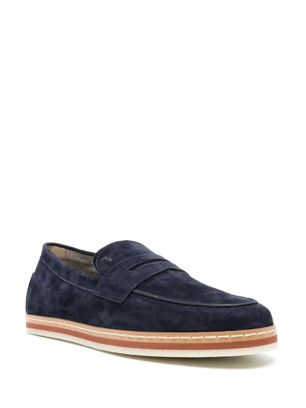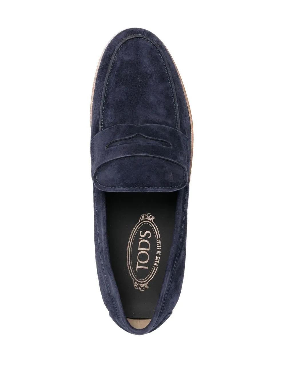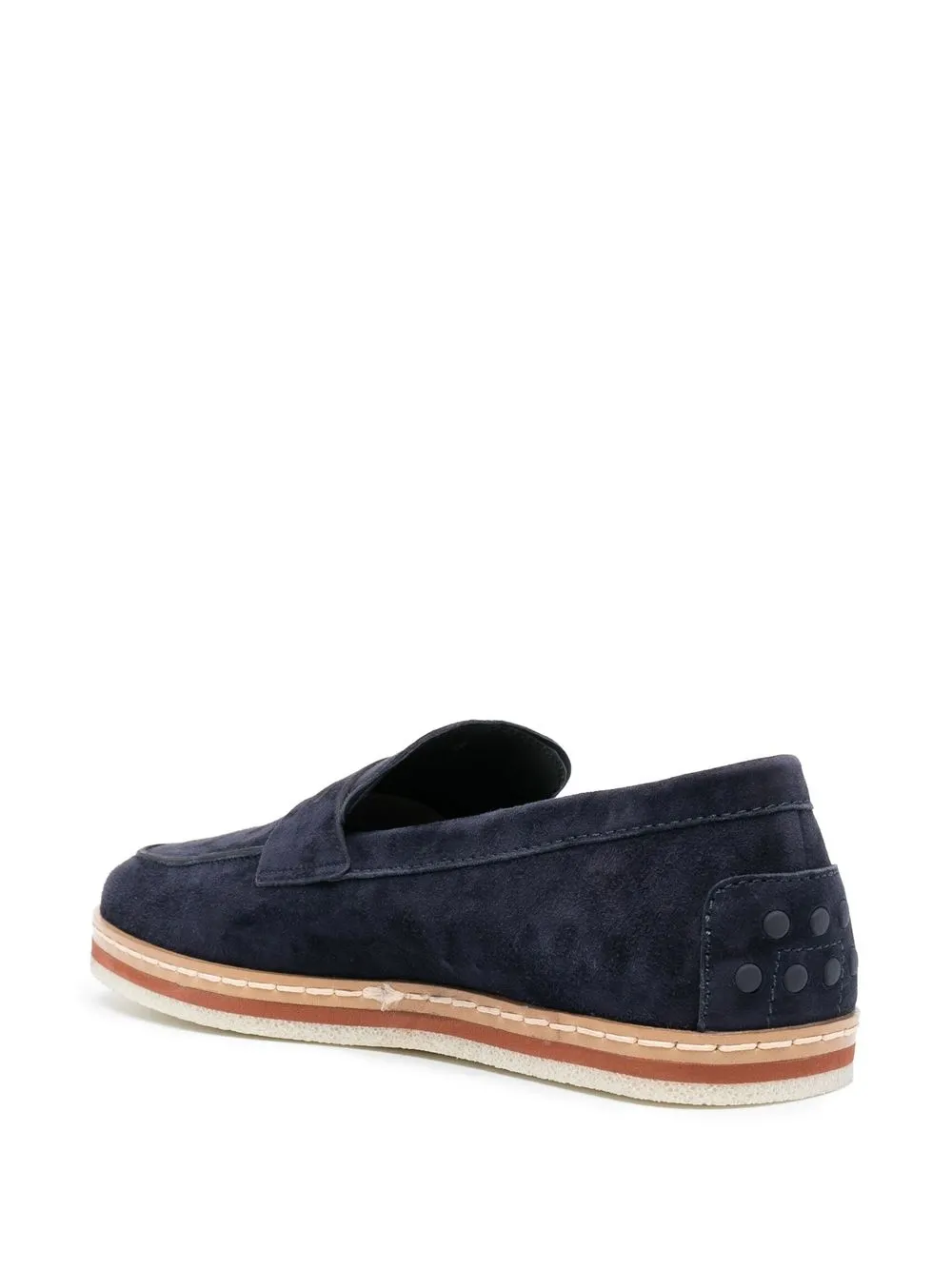 Committed to presenting timeless designs, TOD’S introduces loafers. This blue pair is crafted from suede and distinguished by the signature rubber pebble detailing on the heel.